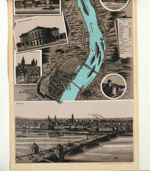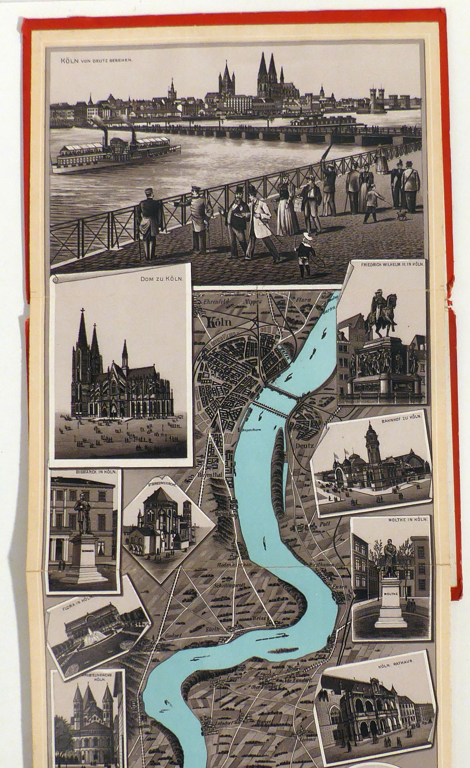 [Mainz-Köln]. Dresden: Dresdner Kunstanstalt vorm. Moritz Zöbel Act. Ges., o.J.. 238 x 23 cm (bxh), gefaltet 16 x 23 cm, Lithogravur in Braunton mit einer Zusatzfarbe in Blau. Einband: Original-Pappband mit Titelverzierungen in Gold. Format: kl.8°, quer. Fünfzehnfach gefaltetes Leporello mit dem Rheinlauf von Mainz bis Köln, links und rechts eingeklinkt in Quadraten, Rechtecken und Kreisen Darstellungen von Orten und deren Sehenswürdigkeiten. Das Leporello beginnt mit einer Ansicht über den Rhein hinweg mit Strassenbrücke (heute Theodor-Heuss-Brücke) und Dom, Köln wird von Deutz aus gezeigt
