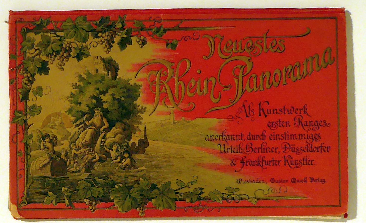 Als Kunstwerk ersten Ranges anerkannt, durch einstimmiges Urteil: Berliner, Düsseldorfer & Frankfurter Künstler. Wiesbaden: Gustav Quiel's Verlag, o.J.. Einband: Roter Or.Ln. mit farbiger Deckelillustration. Format: Quer-4°. Lithographiertes Panorama als Leporello (Länge 236 cm)
