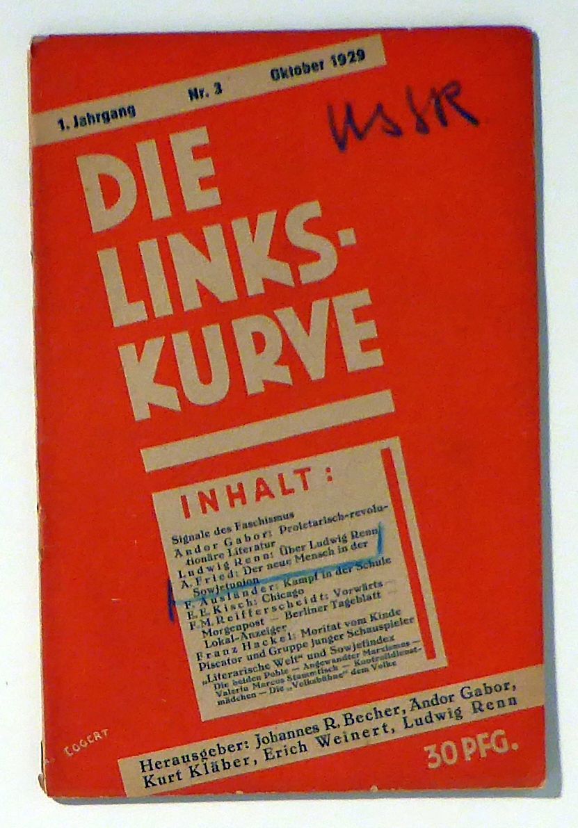 Im Auftrag des Bundes proletarisch-revolutionärer Schriftsteller Deutschlands hrsg. von Johannes R. Becher, Andor Gabor, Kurt Kläber, Erich Weinert, Ludwig Renn. Bln.: Internationaler Arbeiterverlag, 1929. 31, (1) S., Einband: Or.br. Format: 8°. Reihe: Die Linkskurve, . 1. Jahrgang, Nr. 3.