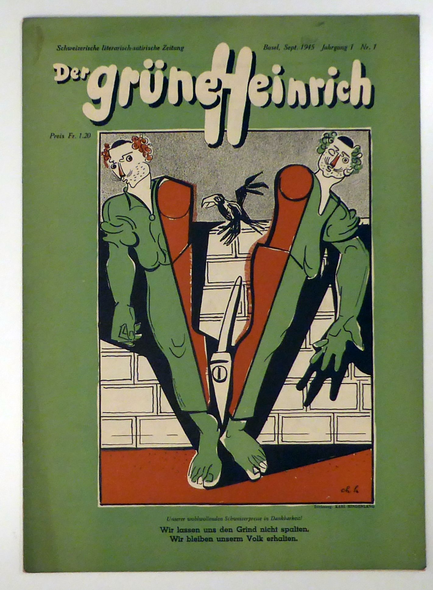 Schweizerische literarisch-satirische Zeitung. Basel: Horizont AG, 1945. 5 Hefte mit insgesamt 99 Seiten, Einband: Original-Broschur, klammergeheftet. Format: gr.4°. Reihe: Der grüne Heinrich, Werbenummer und Nummer 1-4, 1945.