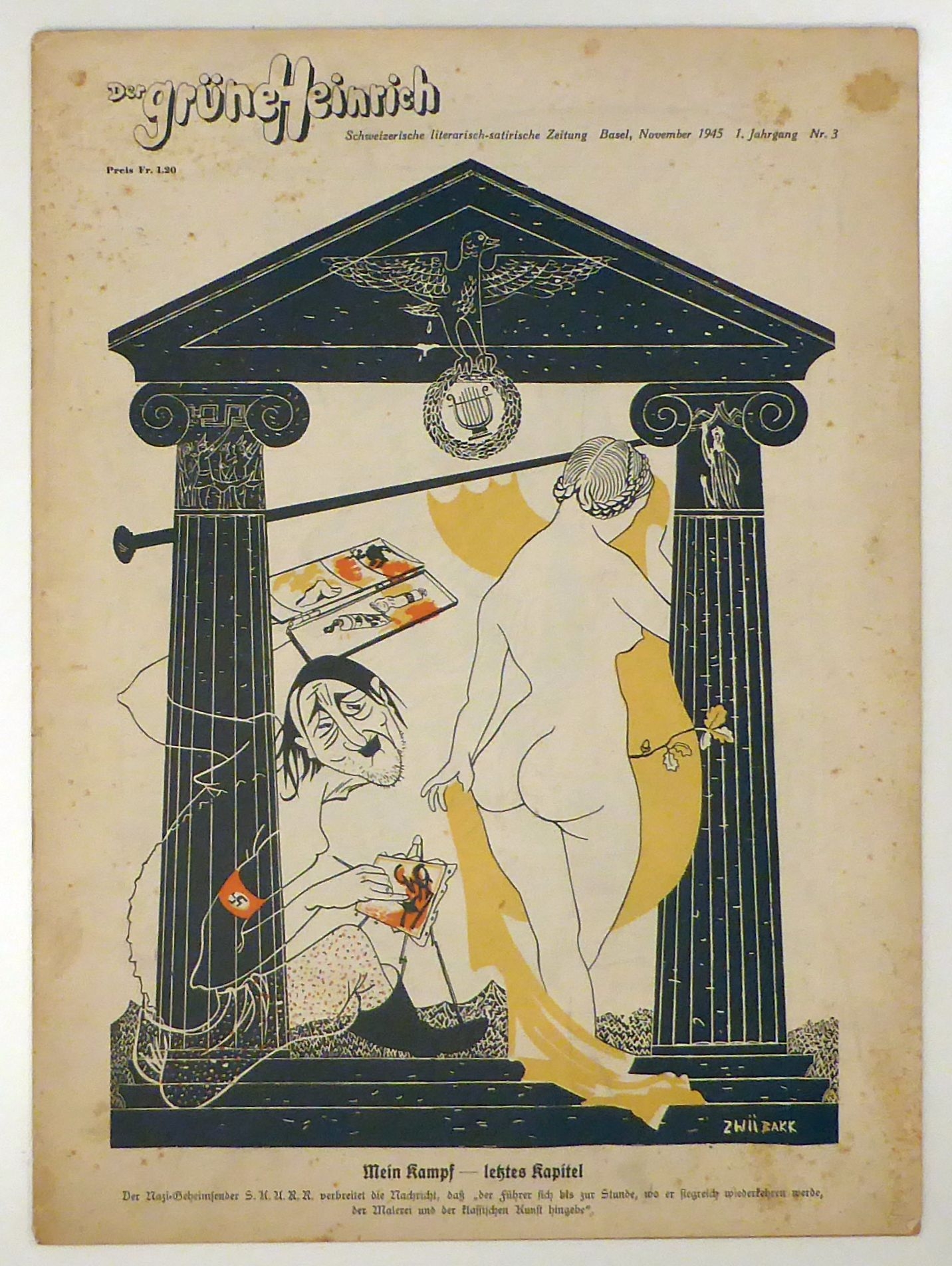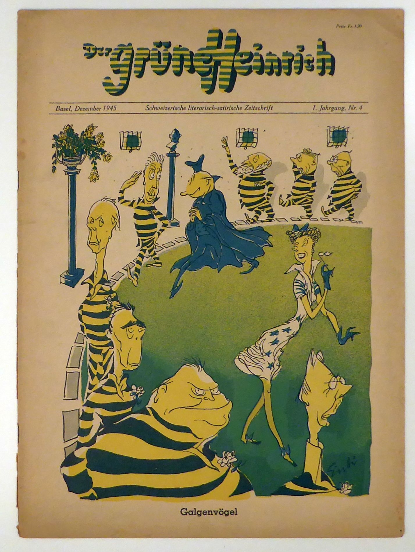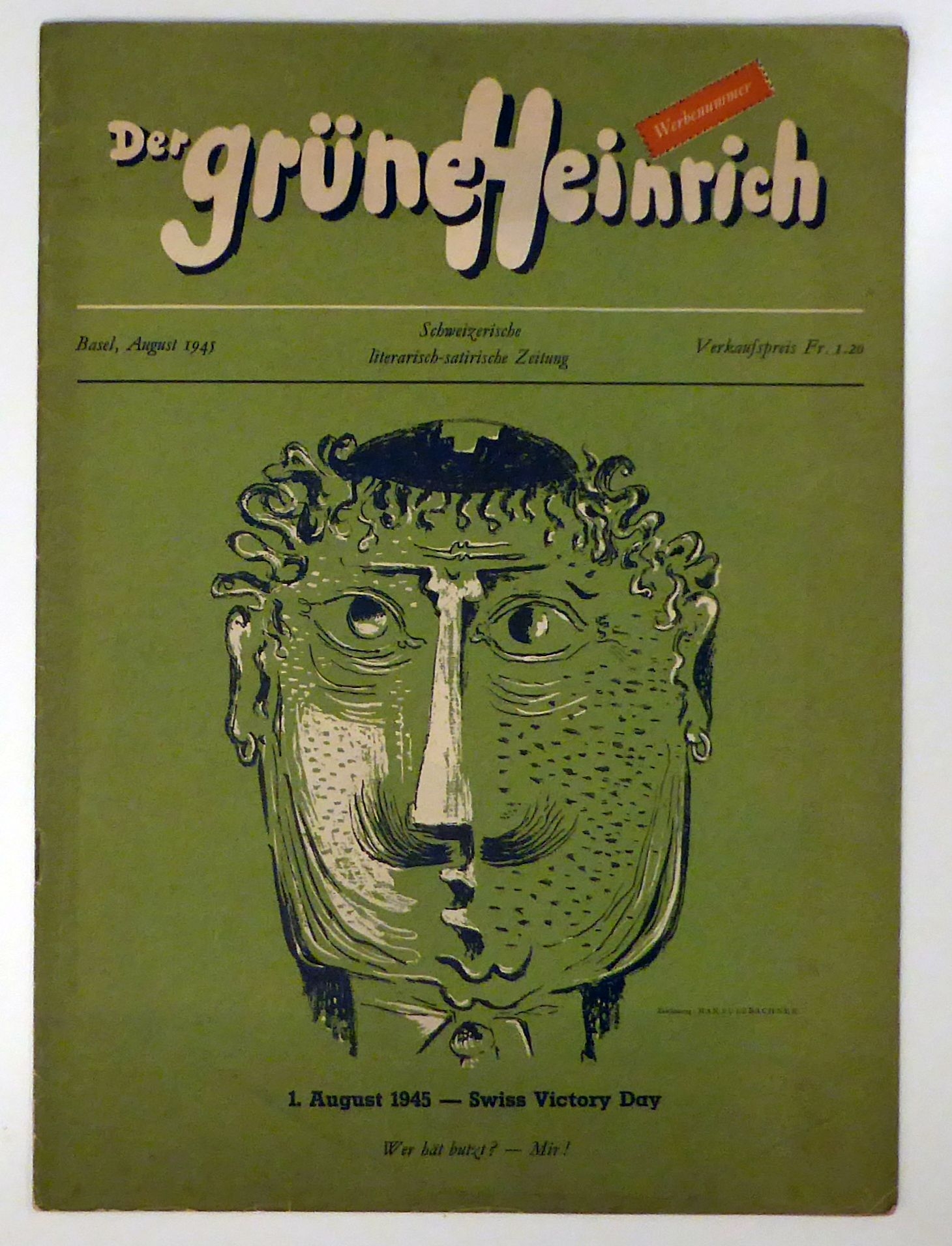 Gleich nach Ende des Zweiten Weltkriegs gegründete satirisch-humoristische Zeitschrift von der zwischen August und Dezember 1945 insgesammt 5 Nummern erschienen. Zu den Initianten gehörte die Partei der Arbei und zu ihrem Umfeld gehörende Persönlichkeiten. Zu den Autoren gehörten unter anderem C. F. Vaucher, Paul Senn, Carl A Loosli, Ernst Hohl, Peter Surava und Ludwig Hohl, zu den Illustratoren und Fotografen Max Sulzbachner, Heinrich Danioth, Charles Hindeling, Paul Iribe, Hans Erni, Irene Zurkinden, Paul Senn, Coghuf, Lindi, Hans Falk und zahlreiche andere. Mehr nicht erschienen. Vollständig sehr selten
