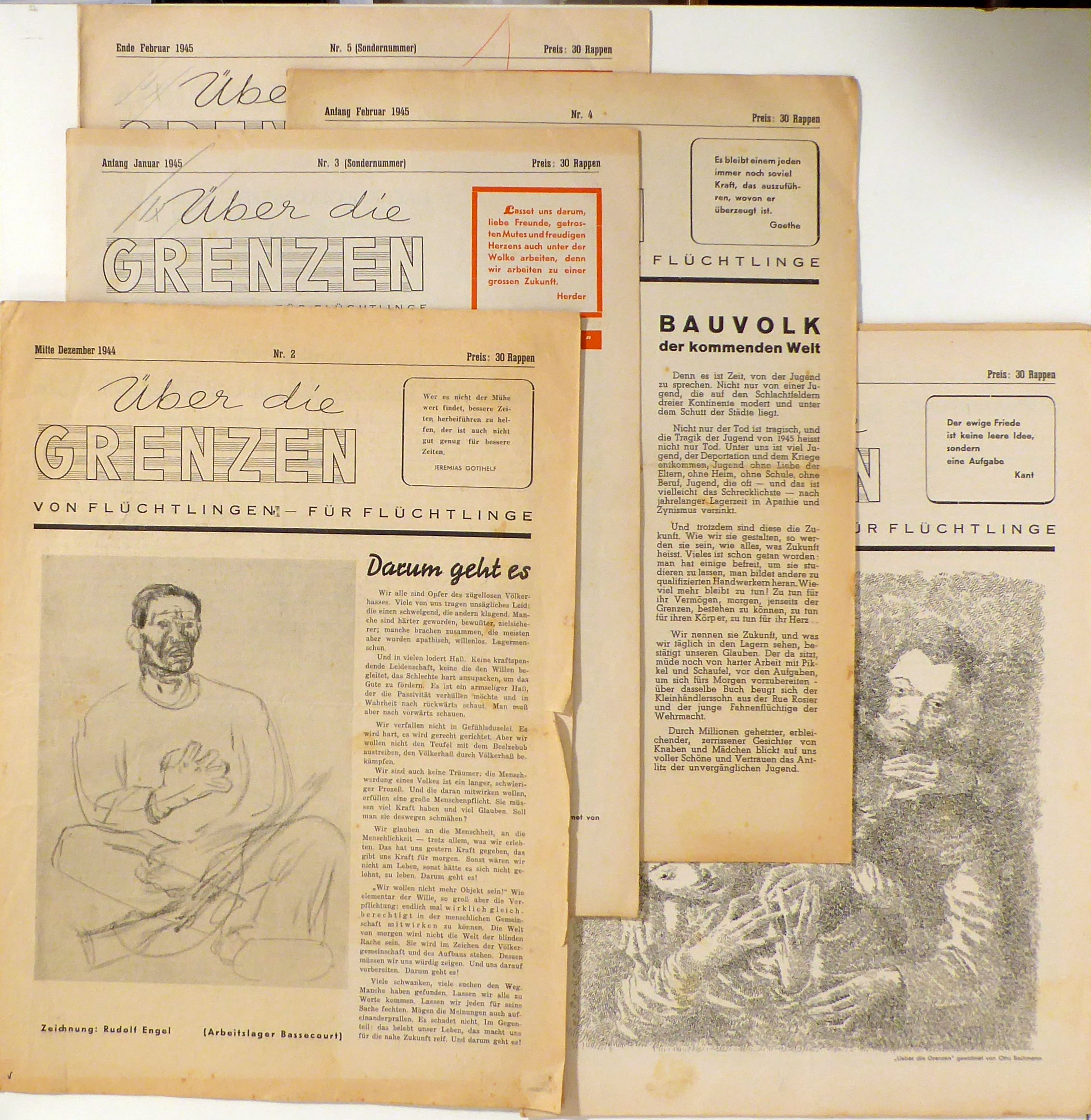 Von Flüchtlingen - für Flüchtlinge. Nr. 2-10, Mitte Dezember 1944 - Mitte August 1945. (Wallisellen-Zch.): 1944-1945. 9 Hefte (von 14), je 12 S., mit zahlreichen Abbildungen nach Zeichnungen und Fotografien. Einband: Original-Broschur, klammergeheftet. Format: 4°. Reihe: Über die Grenzen.
