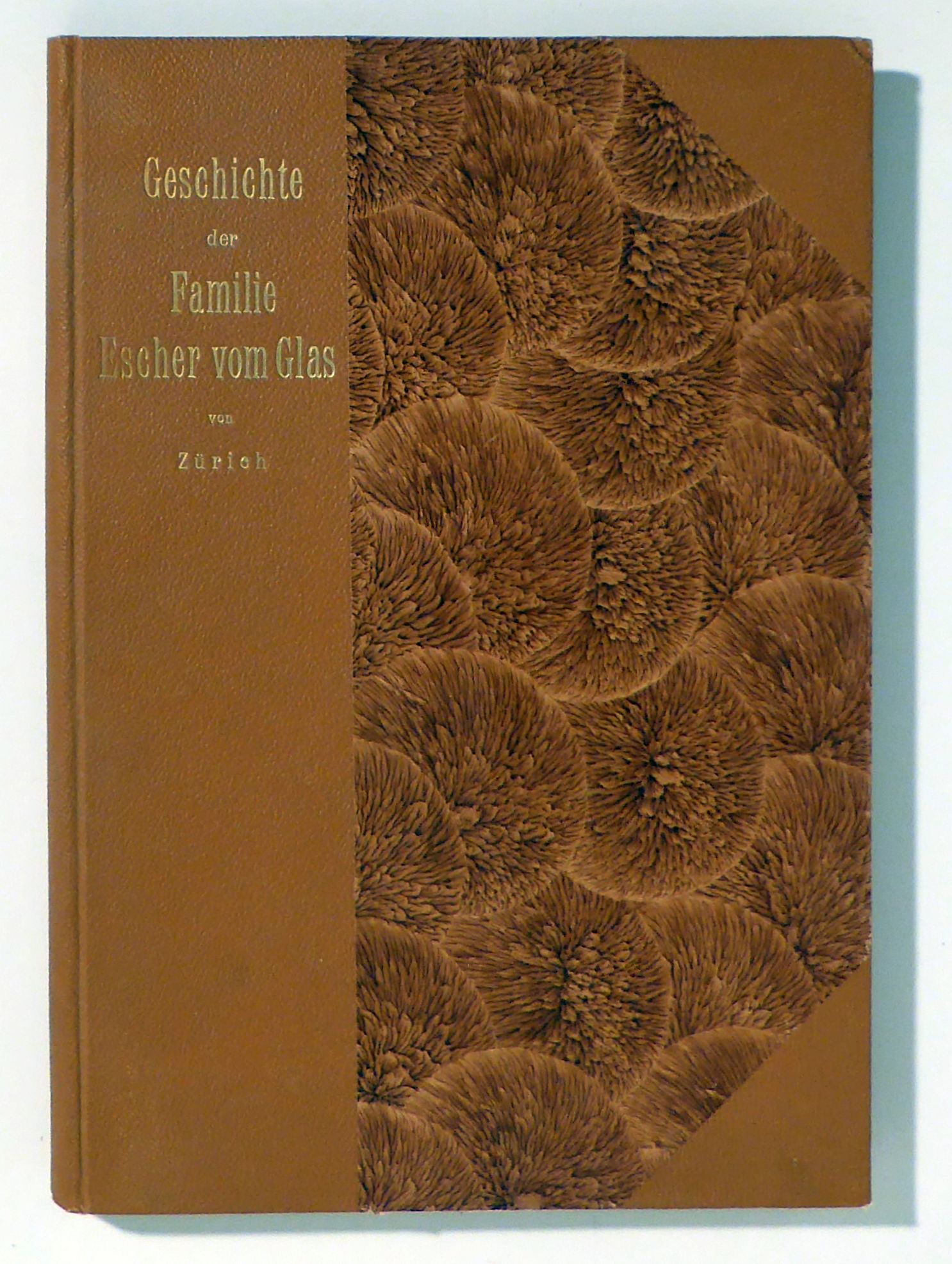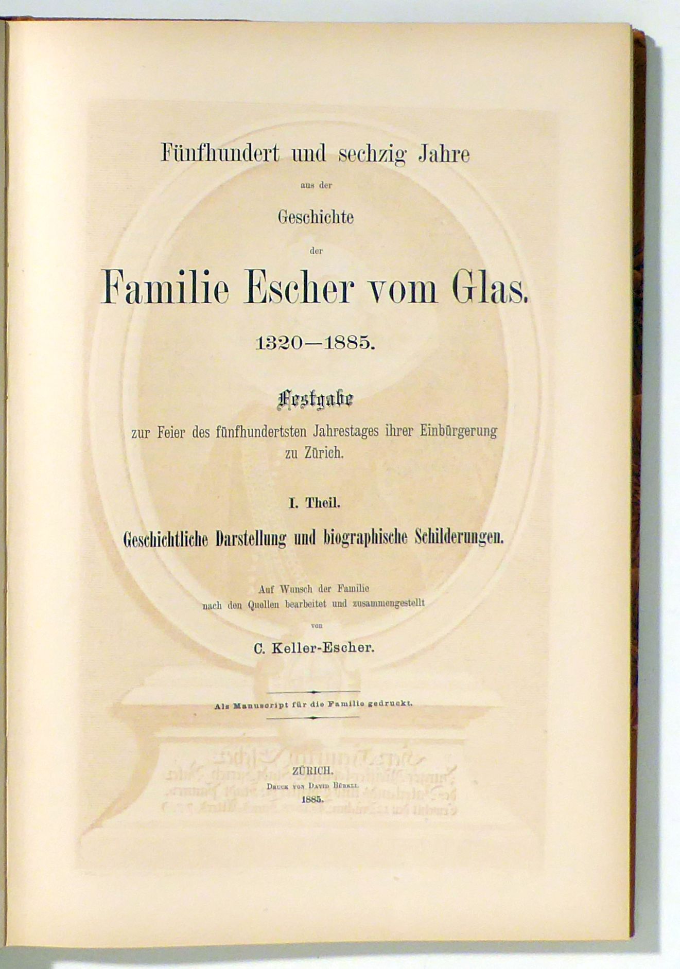 Auf Wunsch der Familie nach den Quellen bearbeitet und zusammengestellt von C(arl) Keller-Escher. Als Manuscript für die Familie gedruckt. Zch.: Druck: David Bürkli, 1885. 149 S., mit 12 Tafeln, davon eine als Frontispiz sowie einer farbigen, montierten Wappentafel als Frontispiz. Einband: Original-Leinwand. Format: 2°. Erstausgabe. Barth 10752. - Erster Teil und Textband der mehrbändigen Geschichte der Zürcher Familie Escher vom Glas. Neben den elf Porträttafeln eine mit der Abbildung von zwölf Siegeln. Der zweite Teil des Werks mit den genealogischen Tafeln liegte hier nicht vor.. Zweiter Theil: Genealogie. Mit doppelblattgrosser Übersicht zu den 12 doppelblattgrossen Stammtafeln. Gedruckt wurde die Geschichte bei dem aus dem gleichen Geschlecht stammenden David Bürkli, dem Herausgeber der Zürcher "Freitags-Zeitung" sowie des "Erinnerers". Zu diesem Werk sind verschiedene Nachträge erschienen, die die Genealogie der Familie bis is 21. Jahrhundert fortführen