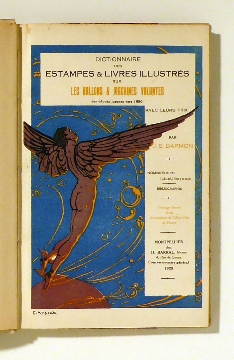 Montpellier: Barral, 1929. 129, (4) S., 4 Bll., mit farbigem Deckelblatt nach E. Blanche sowie zahlreichen, teilweise kolorierten Illustrationen auf Tafeln und im Text. Einband: Halbpergament. Format: gr.8°. Nummerierte Ausgabe, Exemplar 143 (von 1000) auf Velin Bouflant.- Bibliographischer Katalog früherer Aviatik, insbesondere Ballone und Flugdrachen, mit Handelspreisen. Die Illustrationen datieren zumeist aus dem späten 18. Jahrhundert