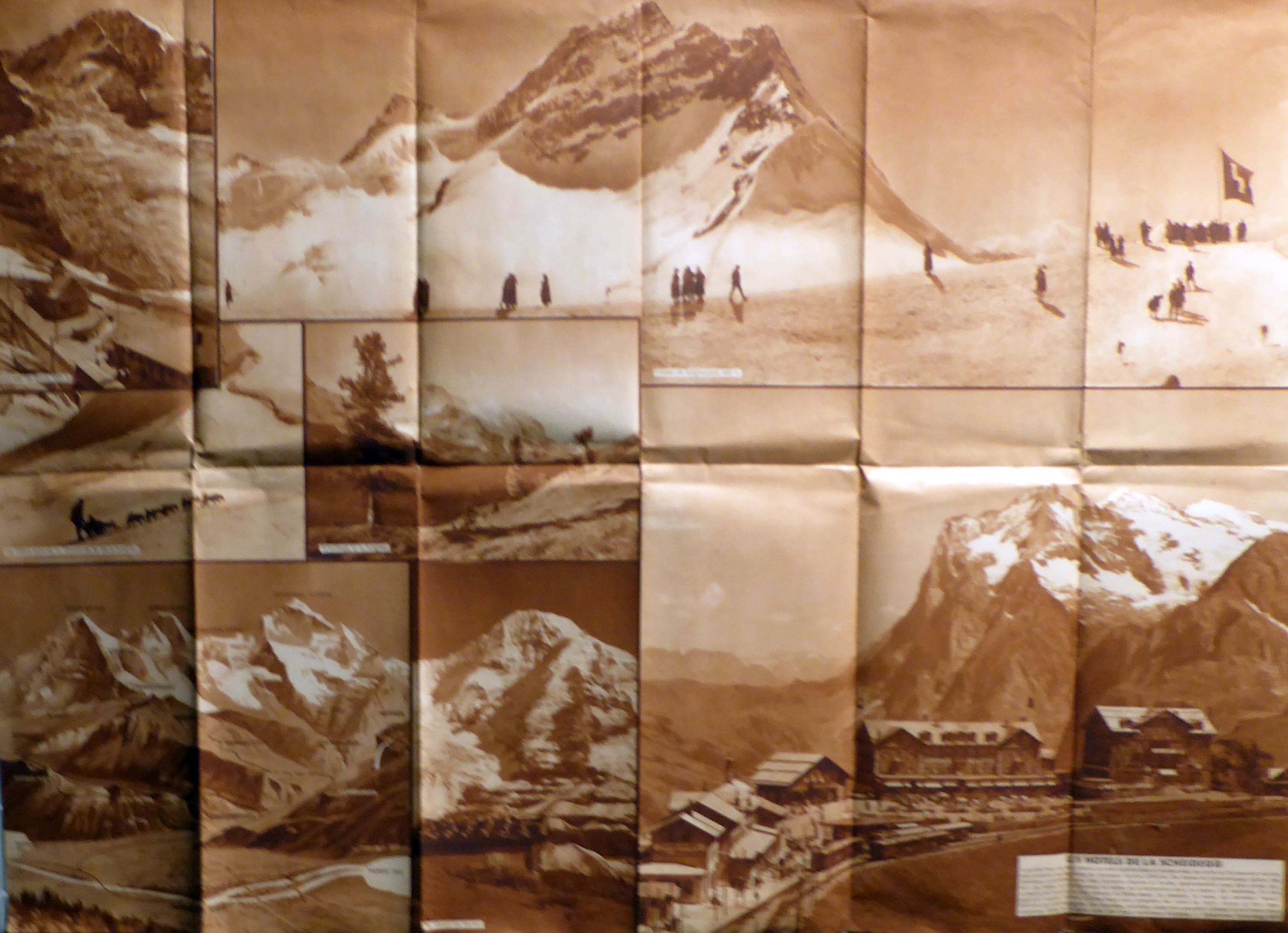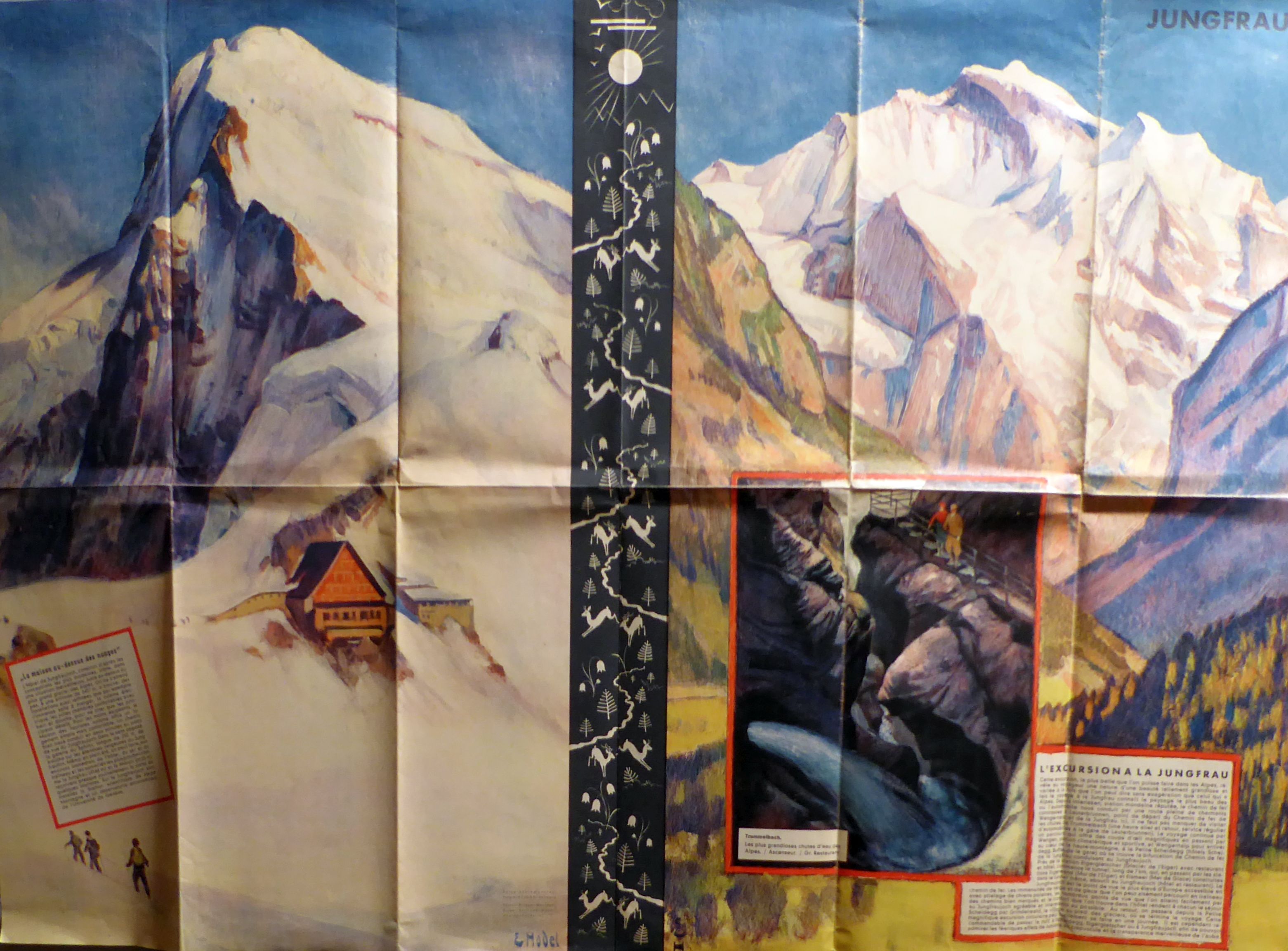 Zofingen: Ringier, um 1930. 1 Bl., mit 3 mehrfarbigen Fotogravuren und einem vertikalen Band auf der Aussenseite sowie 7 Abildungen nach Fotografien in Sepia. Einband: Einblatt. Format: 72x52 cm (bxh), gefaltet 12x26 cm. In jedes der beiden mächtigen Bilder ist ein Text in französischer Sprache eingeklinkt mit einer Beschreibung des Hotels auf dem Jungfraujoch und der Beschreibung eines Ausflugs in die Jungfrauregion. Dem grossflächigen Bild von der Jungfrau in Weiss gegenüber steht die kleinere, in dunkleren Blautönen gehaltene Sicht in den Trümmelbach. Während alle Abbildungen nach Fotografien - Eismeer, Jungfraujoch, Scheidegg im Sommer, Schlittenhunde, Mönch und Panoramasicht von Eiger, Mönch und Jungfrau von Interlaken aus mit eingezeichneter Linienführung der Jugfraubahn - nur ein Titelwort haben, ist die Abbildung der Station Kleine Scheidegg mit den beiden Hotels mit einer ausführlichen Legende versehen. Das lässt vermuten, das in die Realisierung dieses eindrücklichen Prospekts Fritz von Almen, Hotelier auf der Kleinen Scheidegg, zumindest involviert war. Hodel ist noch heute vor allem wegen der beiden grossen Wandbilder vom Vierwaldstättersee im Bahnhof von Basel präsent. Im Druckvermerk sind, neben dem Drucker Ringier, die Fotografen Brugger, Meiringen, Burger, Berthoud, Gyger und Ryffel, Adelboden aufgeführt. Bei Hugger (Berner Oberland) sind nur Brügger und Gyger verzeichnet. Selten