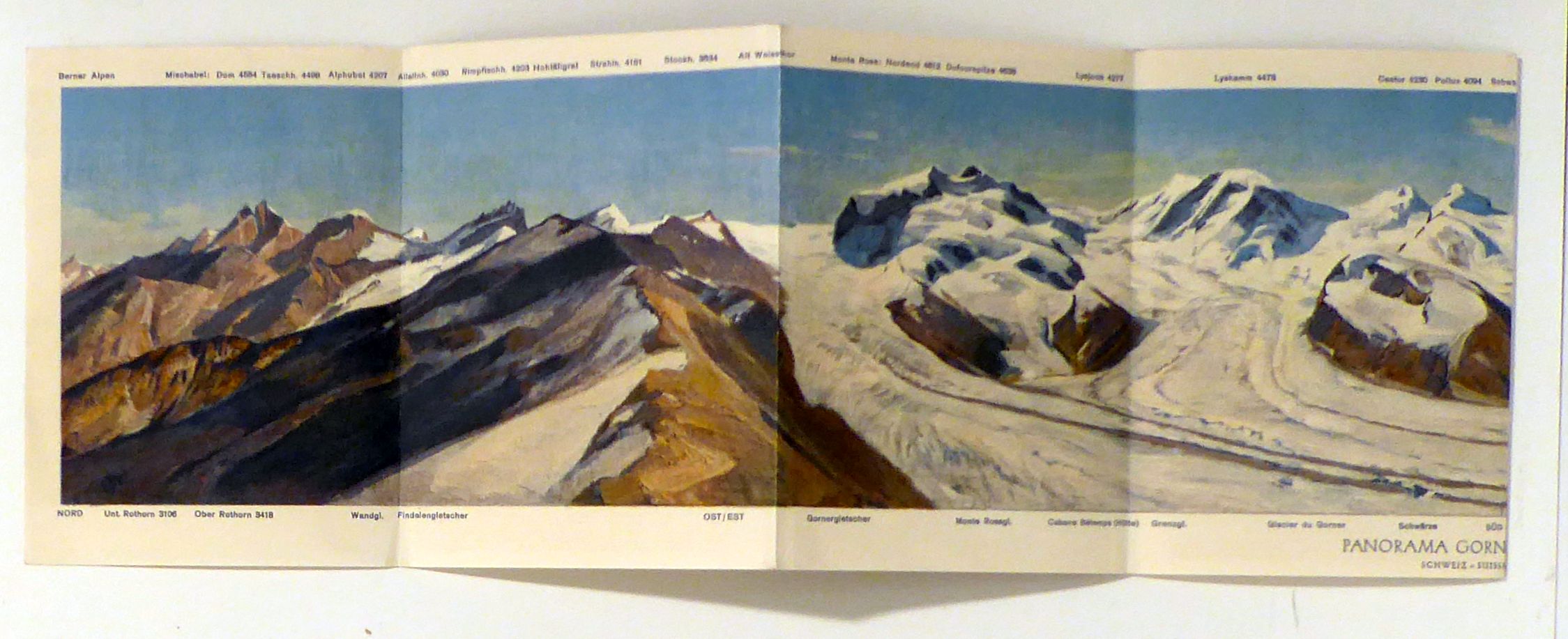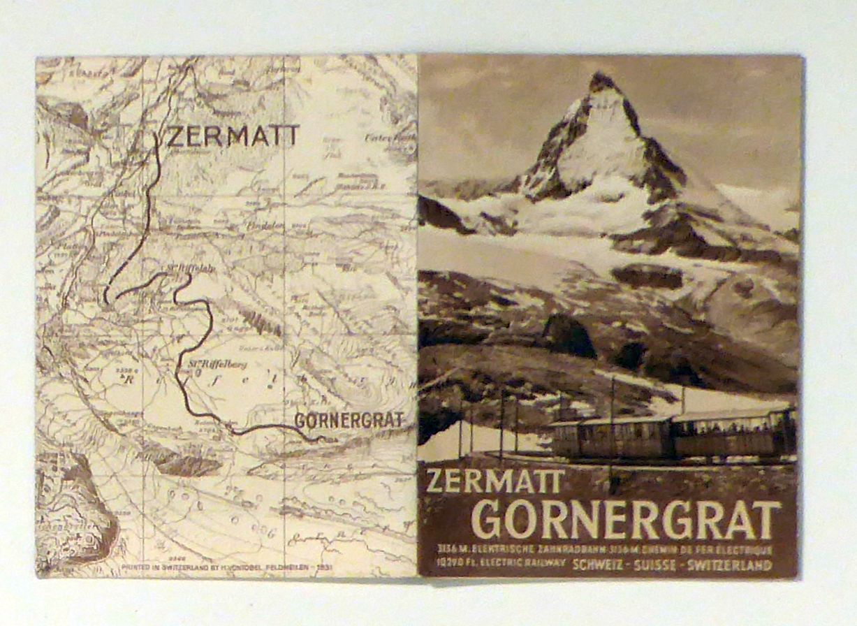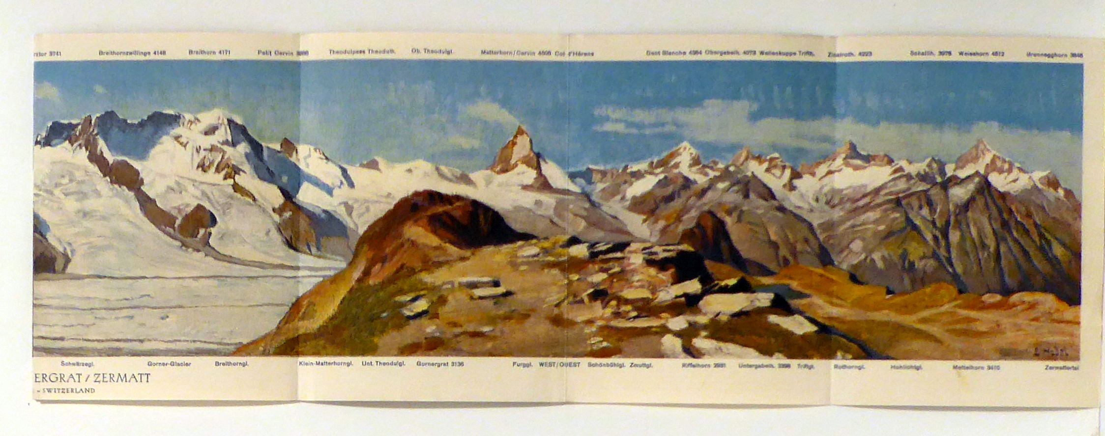 3136 M. Elektrische Zahnradbahn - 3136 Chemin de fer éléctrique - 10290 Electric Railway Schweiz Suisse Switzerland. Feldmeilen: Vontobel, 1931. 1 Bl., mehrfarbiges Panorama von E[rnst] Hodel II (Sohn), sowie 6 Abbildungen nach Fotografien von Jean Gaberell, Emanuell Gyger und Franz Schneider sowie eine Karte. Einband: Einblatt. Format: 88 x 14.7 cm, (bxh), mehrfach gefaltet. Dreisprachiger Text (Deutsch, Französisch, Englisch). Beschreibung von Zermatt und Umgebung, namentlich des Gornergrats sowie der Zahnradbahn. Zu dieser auch technische Details. Gedruckt in Sepia