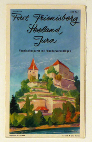 Vogelschaukarte mit Wandervorschlägen = Carte à vol d'oiseau avec propositions d'excursions. Aarau: Trüb & Cie, o.J.. 1 Bl., mit 9 kleinen Schwarz-Weiss-Abbildungen nach Fotografie und einer farbigen Vogelschaukarte von Louis Koller. Format: 52.5 x 35.5 (bxh); gefaltet 10.5 x 17.5 cm. Zweisprachiger Text (Deutsch, Französisch)