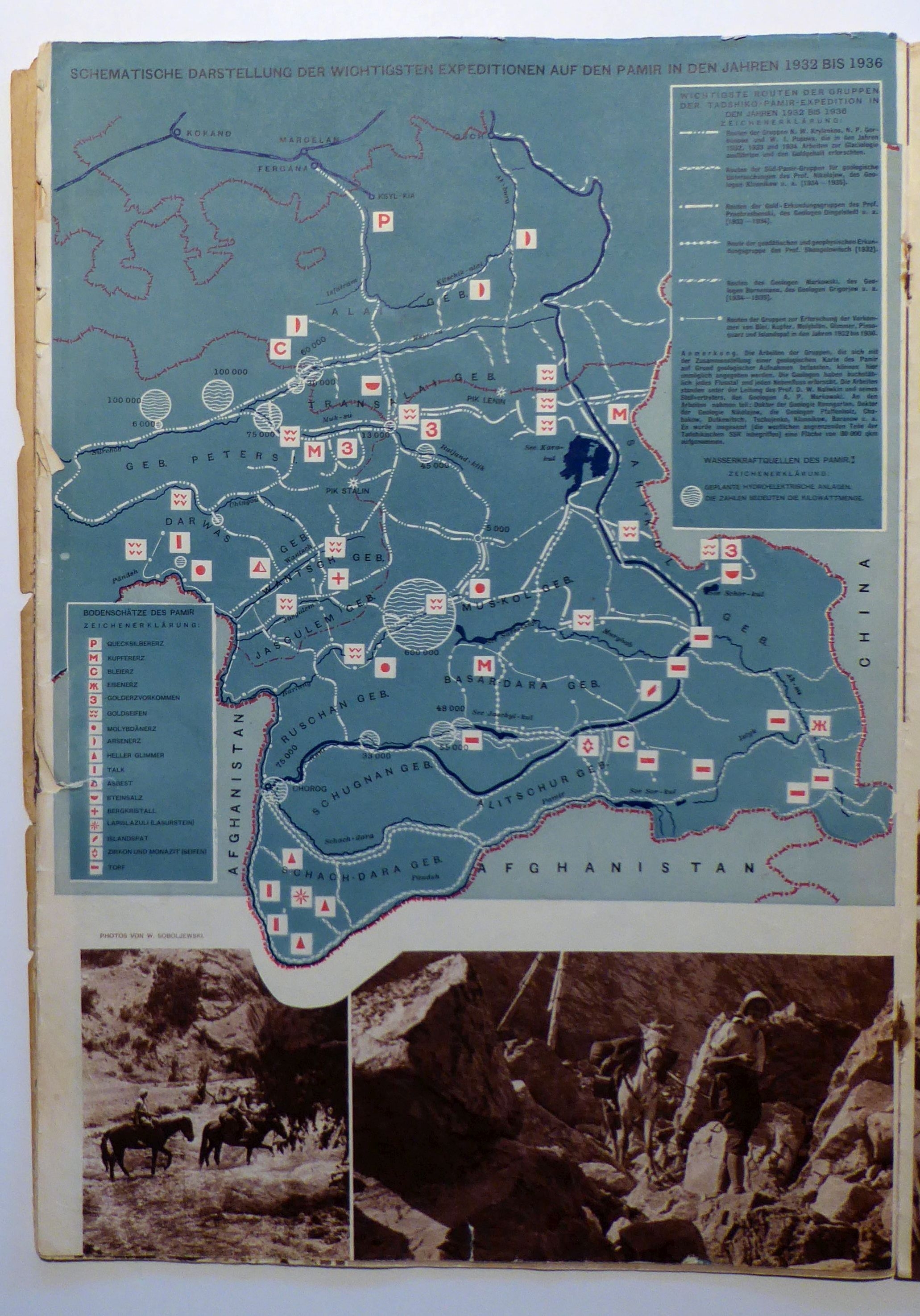 Das Heft behandelt das autonome Sowjetgebiet Gorno-Badachschan (Taschikistan). Plan und Text von El Registan. Aus dem Russischen von Henriette Gayan. Redigiert von Franz Leschnitzer. Gestaltung des Hefts Zoja Dejneka.Die Monatsschrift «USSR im Bau» = «URSS en construction» erschien in vier Sprachen (deutsch, französisch, englisch, spanisch) von 1930 bis 1941 und noch einmal 1949. Zum Redaktionskollegium der von Maxim Gorkij gegründeten Zeitschrift gehörten unter anderen Georgij Pjatakov und Michail Kol’cov, einzelne Nummern erschienen unter der Leitung von Aleksandr Rodčenko oder El’ Lisickij. Viele Nummern wurden von Nikolaj Stepanovič Trošin gestaltet. Hauptsächliches Gestaltungsmerkmal war die Fotomontage, mit Beiträgen von Fotografen wie Maks Al’pert, einem der Begründer der Fotoreportage, Arkadij Šajchet und anderen. Jedes Heft war einem bestimmten Thema gewidmet