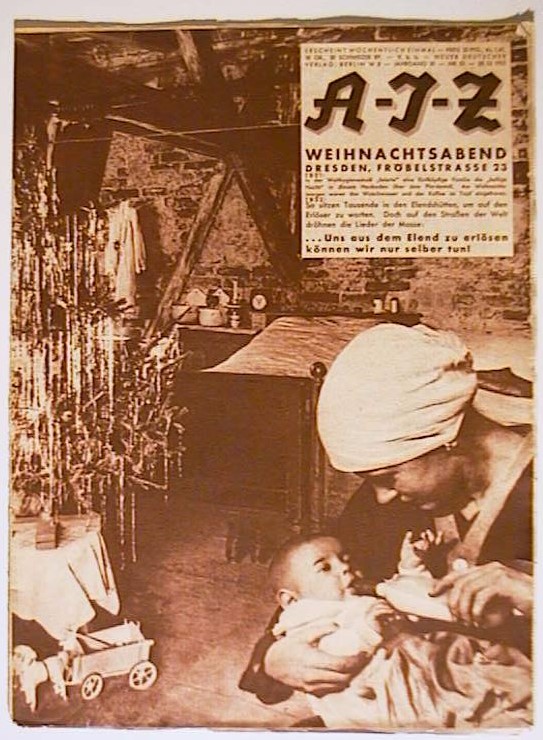 Weihnachtsabend Dresden, Fröbelstrasse 23. Mit der Fotomontage von John Heartfield "Kleiner SA-Mann, was nun?" zur Beurlaubung Gregor Strassers durch Adolf Hitler (S. 1227). Zudem: "Der Heimarbeiter hungert, friert, der Nazihändler profitiert. Heimar. Bln.: Neuer Deutscher Verlag, 1932. S. 1219-1238, mit zahlreichen Abbildungen nach Fotografien. Einband: Illustrierter Original-Umschlag. Format: 28 x 38 cm. Reihe: A-I-Z (Arbeiter-Illustrierte-Zeitung).