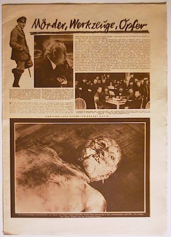 "Jorns-Prozess: Erstveröffentlichung des einzigen Originalfotos der ermordeten Rosa Luxemburg." Im Innern die dazugehörige Reportage: "Mörder, Werkzeuge, Opfer". Bln.: Neuer Deutscher Verlag, 1929. 16 S., mit zahlreichen Abbildungen nach Fotografien. Einband: Illustrierter Original-Umschlag. Format: 30 x 44 cm. Reihe: A-I-Z (Arbeiter-Illustrierte-Zeitung).