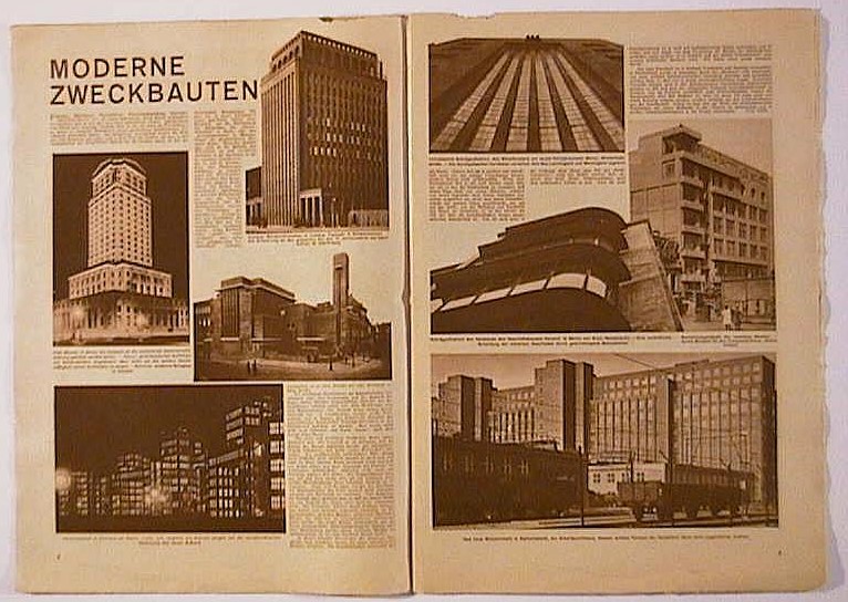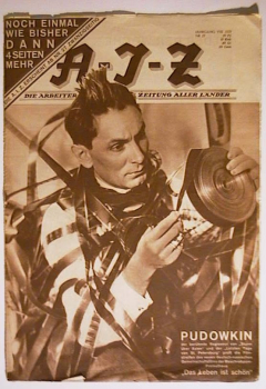 "Pudowkin prüft die Filmstreifen des neuen deutsch-russischen Gemeinschaftsfilms "Das Leben ist schön"". Zudem: "Moderne Zweckbauten", eine zweiseitige Reportage. Bln.: Neuer Deutscher Verlag, 1929. 16 S., mit zahlreichen Abbildungen nach Fotografien. Einband: Illustrierter Original-Umschlag. Format: 30 x 44 cm. Reihe: A-I-Z (Arbeiter-Illustrierte-Zeitung).