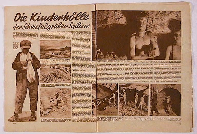 "Italien, ein Volk in Ketten". Beginn der Reportage des Sonderberichterstatters Alfred Kurella über das faschistische Italien. In diesem Heft: "Die Schwefelhöllen Siziliens". Bln.: Neuer Deutscher Verlag, 1931. S. 410 - 427, mit zahlreichen Abbildungen nach Fotografien. Einband: Illustrierter Original-Umschlag. Format: 28 x 38 cm. Reihe: A-I-Z (Arbeiter-Illustrierte-Zeitung).