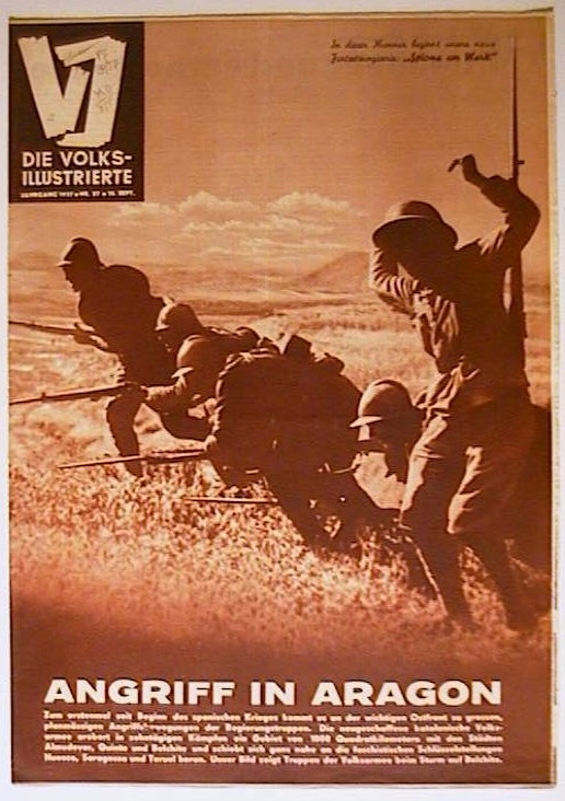 Mit einer Fotomontage von John Heartfield. Die Fotomontage zeigt einen Angriff der Japaner auf ein chinesisches Dorf. Der Text lautet: "Ob Nazimann, ob Samurai, es ist dieselbe Melodei.". Prag: Jan Burger, 1937. [12] S., mit zahlreichen Abbildungen nach Fotografien. Einband: Illustrierter Original-Umschlag. Format: 28 x 38 cm. Reihe: V-I (Volks-Illustrierte).