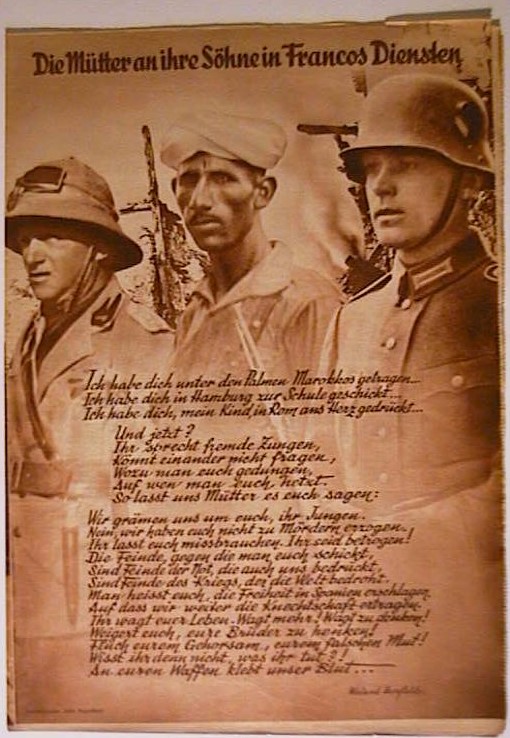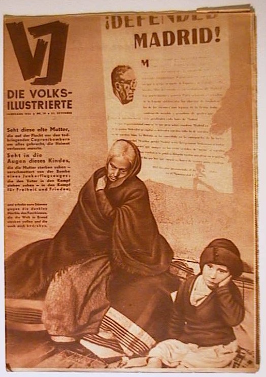 Mit einer Fotomontage von John Heartfield. Die Fotomontage zeigt einen Spanier, einen Marokkaner und einen Wehrmachtssoldaten. Der Text lautet: "Die Mütter an ihre Söhne in Francos Diensten". Das Gedicht in der Montage stammt von Wieland Herzfelde. Prag: Jan Burger, 1936. S. 292 - 303, mit zahlreichen Abbildungen nach Fotografien. Einband: Illustrierter Original-Umschlag. Format: 28 x 38 cm. Reihe: V-I (Volks-Illustrierte).