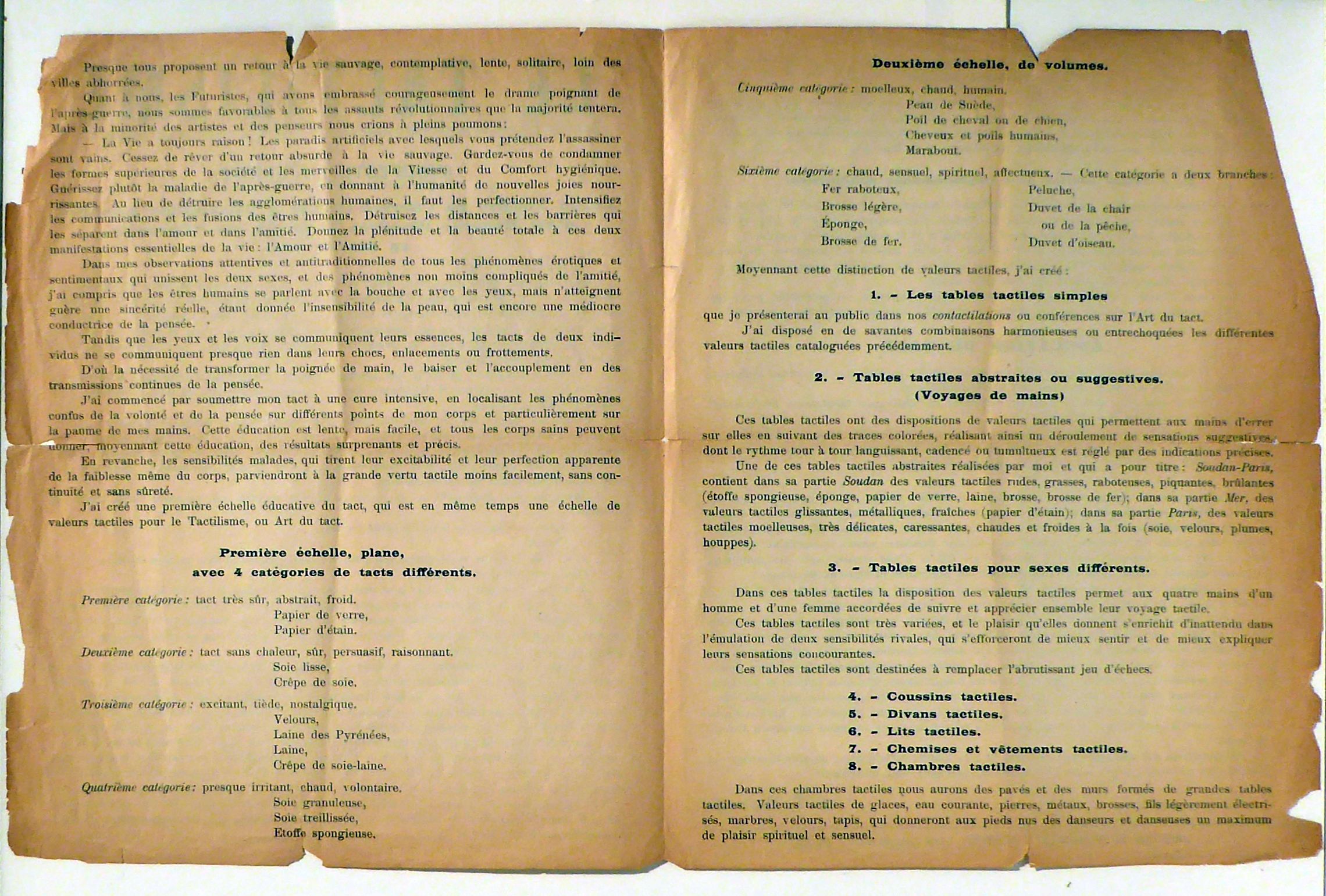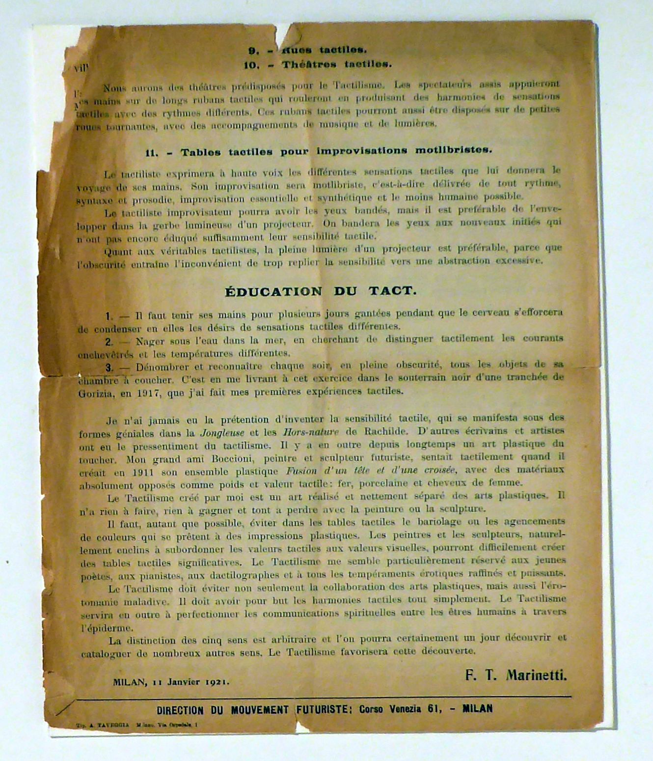 Manifeste futuriste. Lu au Theatre de l'Oeuvre (Paris), à l'Exposition mondiale d'Art Moderne (Genève), et publié par "Comoedia" en Janvier 1921, Milano Direction du Mouvement Futuriste 11 Janvier 1921. Milan: Direction du Mouvement Futuriste, 1921. [4] S., Einband: loser Bogen. Format: gr.8°. Erstausgabe. Nach der Begründung für den Tactilismus - "Dans mes observations attentives et antitraditionnelles de tous les phénomènes érotiques et sentimentaux qui unissent les deux sexes, et des phénomènes non moins compliquées de l'amitié, j'ai compris que les êtres humains se parlent avec la bouche et avec les yeux, mais n'atteignent guère une sincérité réelle, étant donnée l'insensibilité de la peau, qui est encore une mediocre conductrice de la pensée" - folgt eine mehrstufige Einführung zum Erlernen und Ausüben des Tactilismus sowie der Einrichtung tactilistischer Objekte, Räume und Strassen. Vorgetragen wurde das Manifest im Theater der l'Oeuvre in Paris und gleichen Jahres in Italien sowohl in französischer als auch in italienischer Sprache veröffentlicht