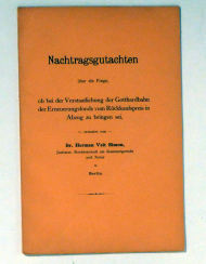 Berlin: Druck der Norddeutschen Buchdruckerei und Verlagsanstalt, [1909]. 35 S., Einband: bedruckter Or.Umschlag. Format: gr. 8°. Nachtragsgutachten an die Liquidationskommission der Gotthardbahn Luzern
