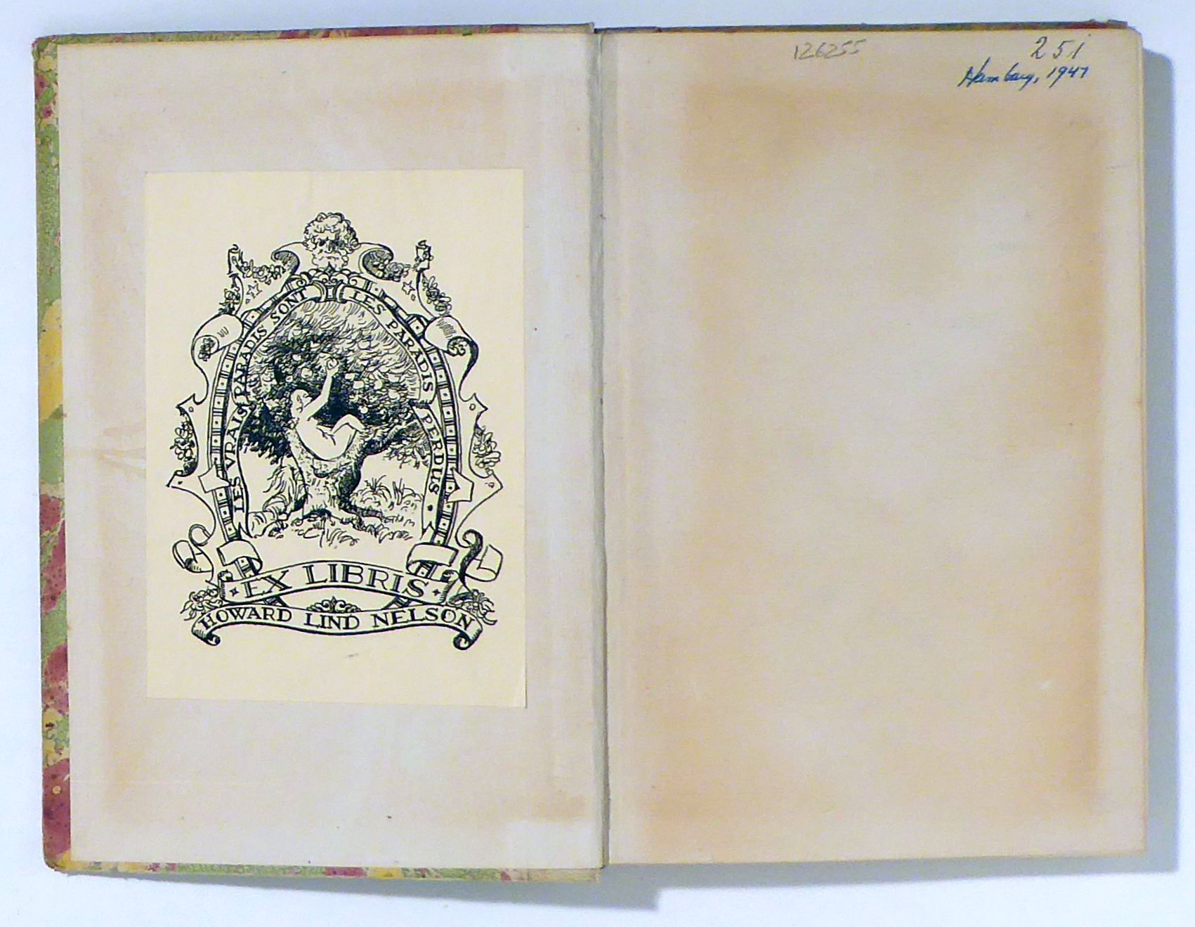 Ein erotisch-satirischer Roman aus der Zeit Karls VII. Mit 21 Kupfern von Moreau le Jeune. Berlin: Pantheon Verlag, 1920. 160, [1] S., mit 21 Kupfern nach Moreau le Jeune auaf Tafeln. Einband: Original-Halbpergament, mit goldgeprägtem Rückentitel in Leder. Format: gr.8°. Nummerierte Ausgabe, Exemplar 418 von 1100, Davon die Exemplare I bis C und 1-300 auf Bütten und mit von Hand abgezogenen Illustrationen. Es ist die erste vollständige Übersetzung in die deutsche Sprache. Als Vorlage für die in Prosa gebrachte Übersetzung des in Versform geschriebenen Originals "La Pucelle d'Orleans" diente Moreck (das ist Konrad Haemmerling) ein nicht gedrucktes Manuskript von Magda Janssen aus der Mitte des 19. Jahrhunderts. Mit dem Ex Libris von Howard Lind Nelson auf dem Innendeckel sowie einem datierten handschriftlichen Vermerk wo und wann er das Buch erworben hat. Für das Ex Libris verwendete er, leicht abgewandelt, das Proust-Zitat "Les vrais paradis sont les paradis perdu".
