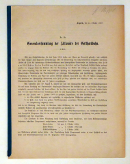 Luzern: Gotthardbahngesellschaft, 1887. 8 S., Einband: Broschur der Zeit. Format: 4°. Zweisprachiger Bericht (deutsch und französisch) an die Aktionäre der Gotthardbahn, in dem über die Verwendung der noch vorhandenen Baugelder informiert wird; im Namen des Verwaltungsrathes der Gotthardbahn gezeichnet vom Vize-Präsidenten Schuster-Burckhardt und vom Sekretär: Schweizer. - Rücken mit blauem Original-Papiertreifen verstärkt
