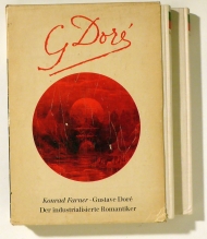 Der industrialisierte Romantiker. Dresden: VEB Verlag der Kunst, 1963. 2 Bde., 346; ca, 300 unpag. Seiten, mit einem montierten Porträt des Künstlers nach einer Fotografie als Frontispiz sowie, im zweiten Band, zahlreichen, meist ganzseitigen Abbildungen auf ca.300 unpaginierten Seiten. Einband: Original-Halbleinwand, in Schuber. Format: 4°. Erstausgabe. Die gedruckte Widmung "für F. D." meint Friedrich Dürrenmatt, der dem Autor, einem der wenigen marxistischen Kunsttheortetiker, während dessen politischer Isolation durch die Schweiz anschliessend an die - von ihm verurteilte - sowjetische Intervention in Ungarn von 1956, nicht nur die mechanische Schreibmaschine schenkte, auf der dieses Werk entstand, sondern ihn über viele Jahre hinweg auch materiell unterstützte. Der Grossteil der Abbildungsvorlagen stammt aus der Doré-Sammlung des Zürcher Buchhändlers und Antiquars Theo Pinkus, der Farner zu dieser marxistischen Analyse der "industrialisierten" Produktionweise Dorés angeregt hatte
