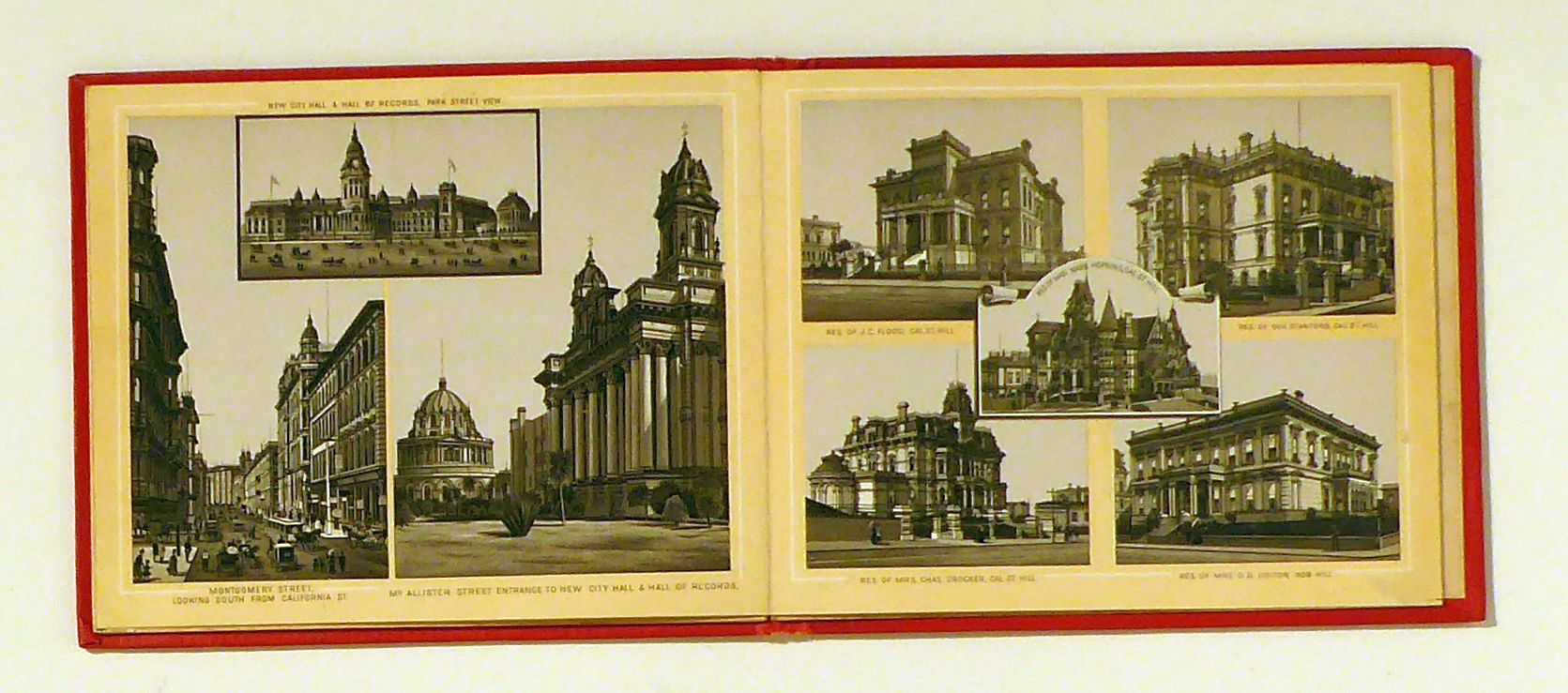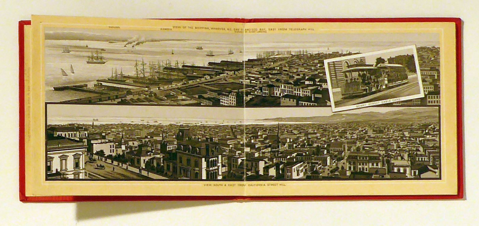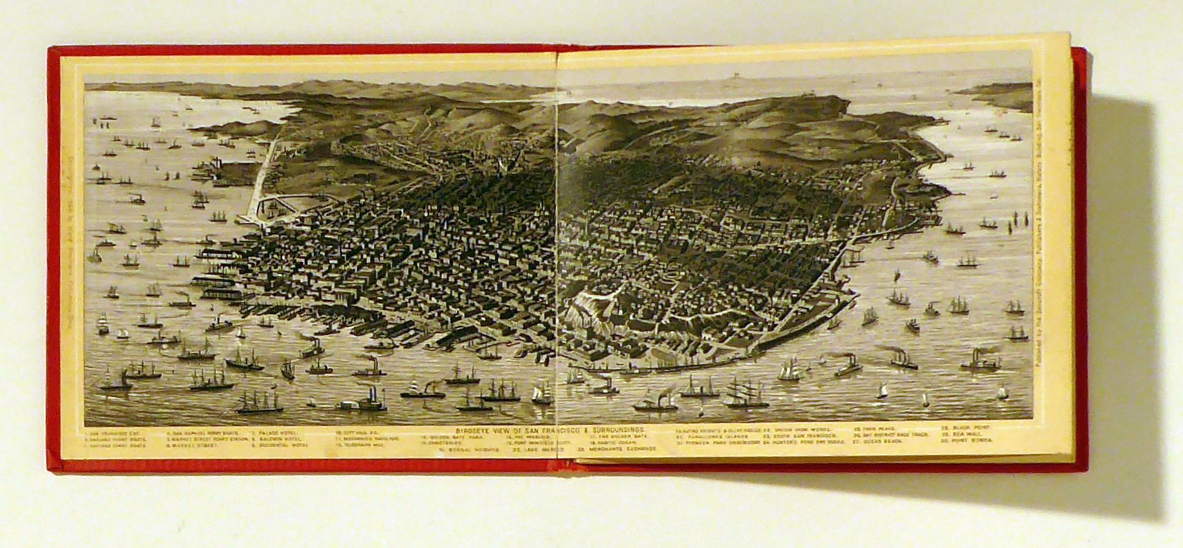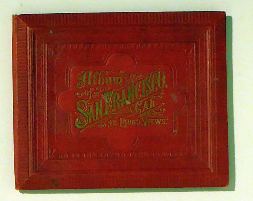 42 Photo Views. San Francisco: Bancroft Co., 1889. [7] Bll., 15fach gefaltetes Leporello 232 x 11,7 cm, mit 42 Photogravuren in Sepia. Einband: blindgepr. roter Or.Ln. mit goldgeprägtem Titel. Format: 8°. Die Bilder zeigen die wichtigsten Gebäude und Strassenzüge der Stadt, Ansichten aus der Umgebung und vor allem eine doppelblattgrosse Vogelschau-Ansicht von der See her (mit zahlreichen Schiffen) auf San Francisco und Umgebung mit einer 33 Nummern umfassenden Legende sowie zwei halbseitenhohe doppelblattweite Panoramaansichten von Telegraph Hill auf Shipping, Wharves und Bay sowie von California Street Hill auf die Stadt im Süden und Osten. Ausserordentlich selten