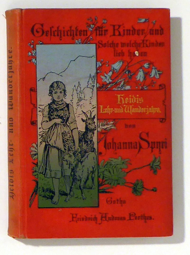 Roter Original-Leinenband, mit einer mehrfarbigen Bergszene (Heidi mit zwei Ziegen) sowie Blumen (Glockenblumen und Gänseblümchen). Der Titel gold- und schwarzgeprägt, das farbige Frontispiz mit einem transparenten Schutzblatt. Weilenmann 3228