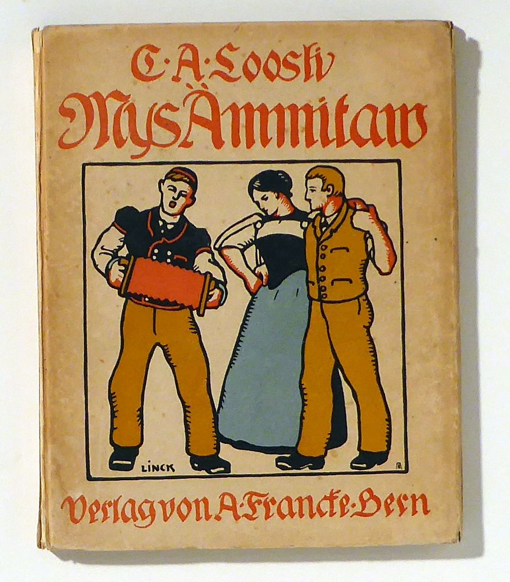 Bern: Francke, 1911. 128 S., Einband: Original-Pappband. Format: 8°. Erstausgabe. Original-Pappband mit roter Typographie und farbiger Deckelillustration nach einer Zeichnung von (Ernst) Linck und eingebogenen Deckelkanten sowie gemusterten Vorsatzpapieren. Unbeschnittenes, breitrandiges Exemplar, gedruckt in Fraktur