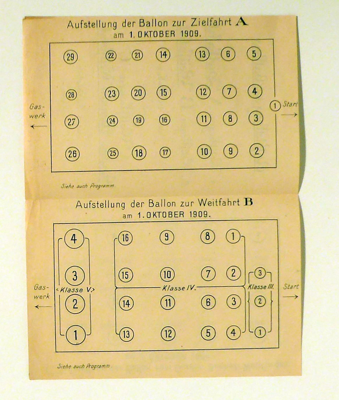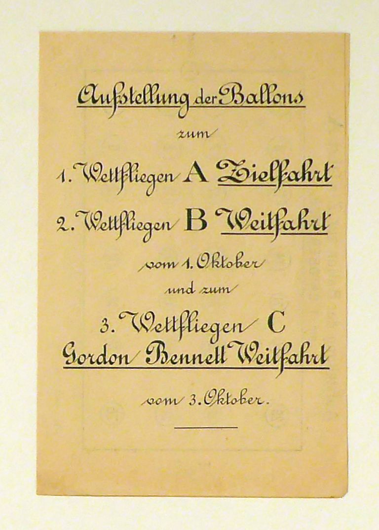 1. Wettfliegen A Zielfahrt 2. Wettfliegen B Weitfahrt vom 1. Oktober und zum 3. Wettfliegen C Gordon Bennett Weitfahrt vom 3. Oktober [1909]. 1909. 1 Bl., Einband: Einblatt. Format: 25 x 19 cm, gefaltet 12,5 X 19 cm. Gefaltetes Blatt mit Titelseite sowie drei Seiten mit blattgrossen Plänen mit den nummerierten Startplätzen für die drei Wettfahrten