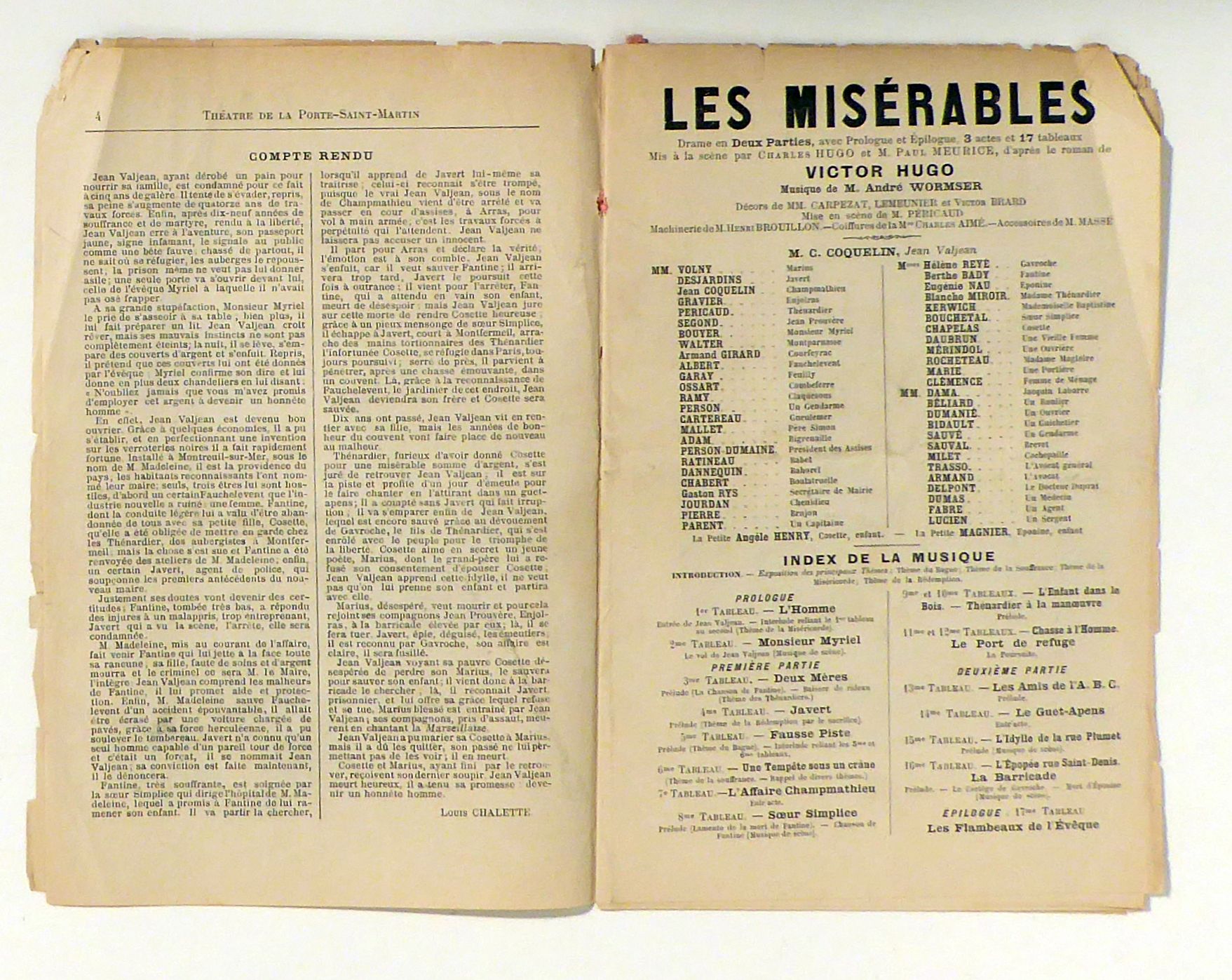 Programmheft für die Inszenierung des Musicals nach dem Roman von Victor Hugo. Regie führten der Sohn des Autors, Charles Hugo und Paul Meurice; Benjamin Constant Coquelin gab den Jean Valjean, Hélène Reyé Gavroche. MIt einer Besprechung der Aufführung von Louis Chalette, einer vollständigen Liste der Besetzung sowie zahlreichen Holzstich-Porträts und Bühnendecors nach Louis Fortuné Méaulle