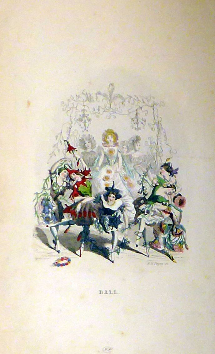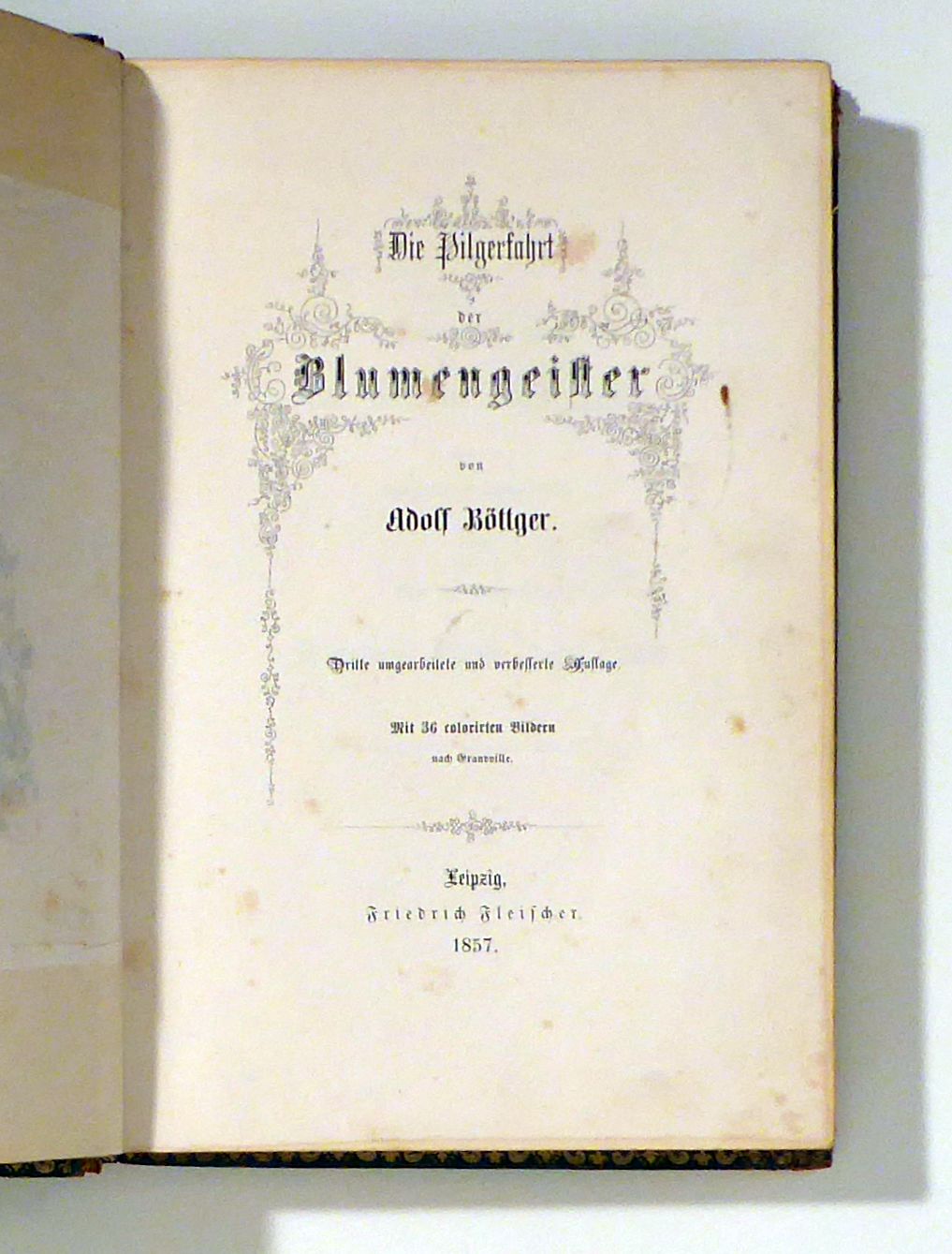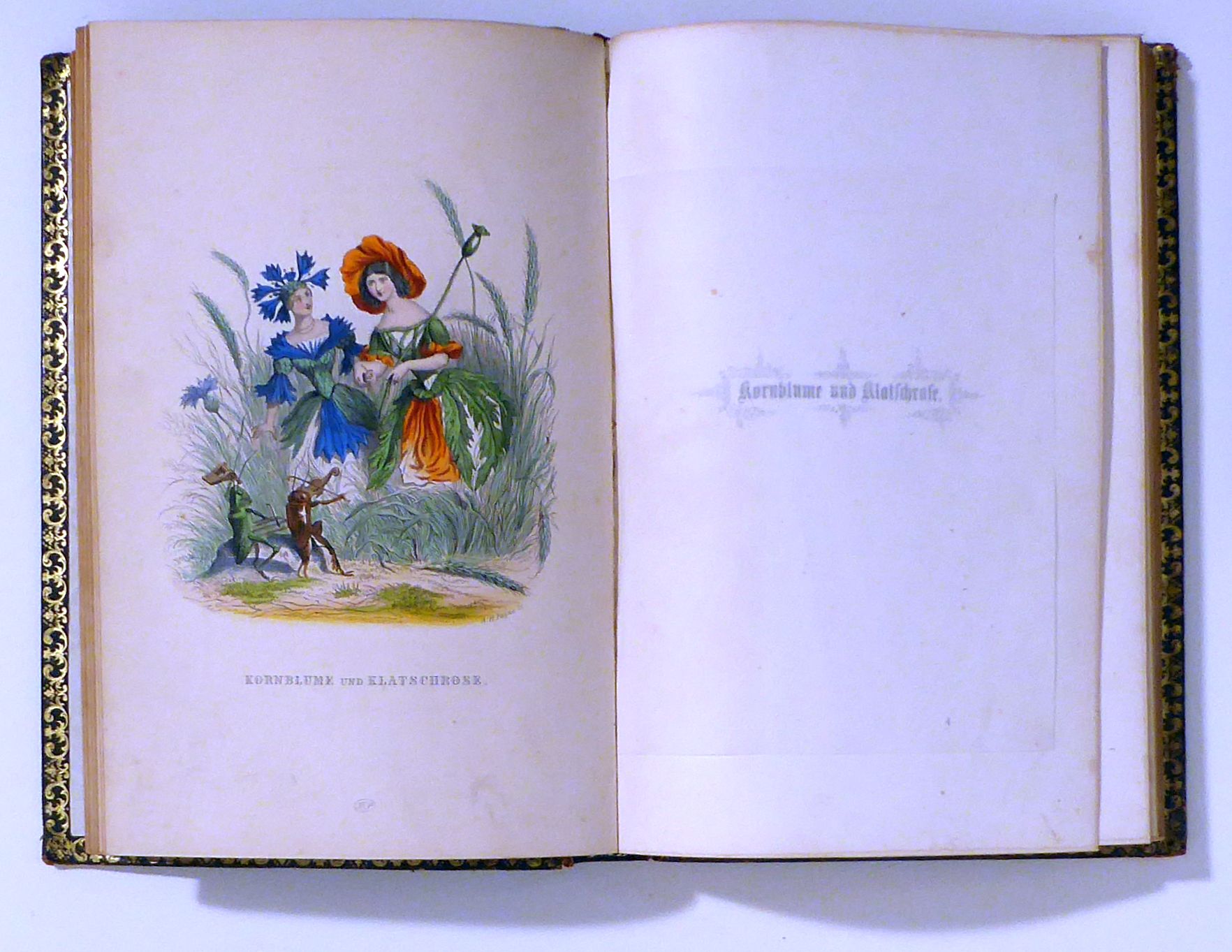 Dritte umgearbeitete und verbesserte Auflage. Mit 36 colorirten Bildern nach Granville (sic). Dritte umgearbeitete und verbesserte Auflage. Leipzig: Friedrich Fleischer, 1857. [4] 296 S., mit 36 handcolorierten Tafeln, jede mit transparentem Seitenhemd. Einband: reichverzierte Original-Leder. Format: 8°. Rümann 2642 (fälschlicherweise 1858). Die sorgfältig kolorierten Illustrationen von Grandville sind "Les fleurs animées" entnommen, gestochen von A[lbert] H[enri] Payne. Reich dekorierter Ganzlederband mit floralen Deckel-, Rücken- und Hinterdeckelverzierungen sowie goldgeprägtem floralen Steg, Spiegel und Vorsatzblätter mit Seide bespannt, rundum Goldschnitt. Die Deckelverzierung mit einer blumenstreuenden Blumenfee, gedruckt in Fraktur