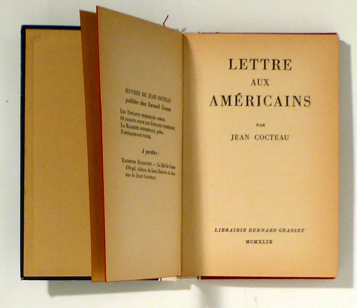 [Paris]: Grasset, 1949. 101, [2] S., Einband: Original-Leder. Format: kl.8°. Unnummeriertes Exemplar der Erstausgabe in einem äusserst aufwendigen Privateinband in Leder in den amerikanischen Farben Rot, Blau und Weiss. Der Vorderdeckel ist blau mit montierten Stars and Stripes (mit 48 Sternen), der Rücken ist weiss und der Hinterdeckel rot. Auch der Schnitt ist rundum blau, weiss, rot. Eine Buchbindermarke fehlt