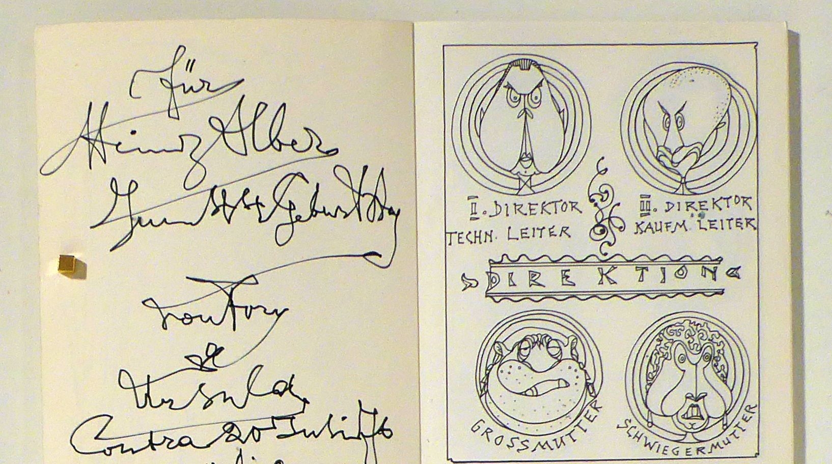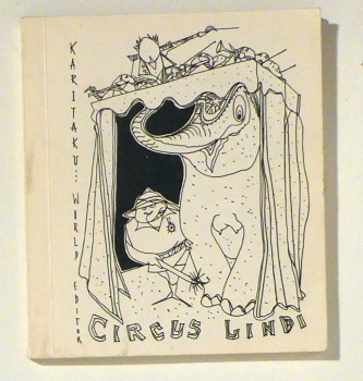 o.O.: Karitaku World Editor, [1976]. 57 Bll., mit 57 s/w-Abbildungen nach blattgrossen Zeichnungen und einer Umschlagzeichnung. Einband: illustrierte Original-Broschur. Format: kl.8°. Erstausgabe. Eine Zirkusgeschichte ohne Worte mit 14 Personen von Lindi, Pseudonym von Alfred Lindegger. Mit einer datierten Widmung mit kalligrafischer Einzeichnung verso Titelblatt