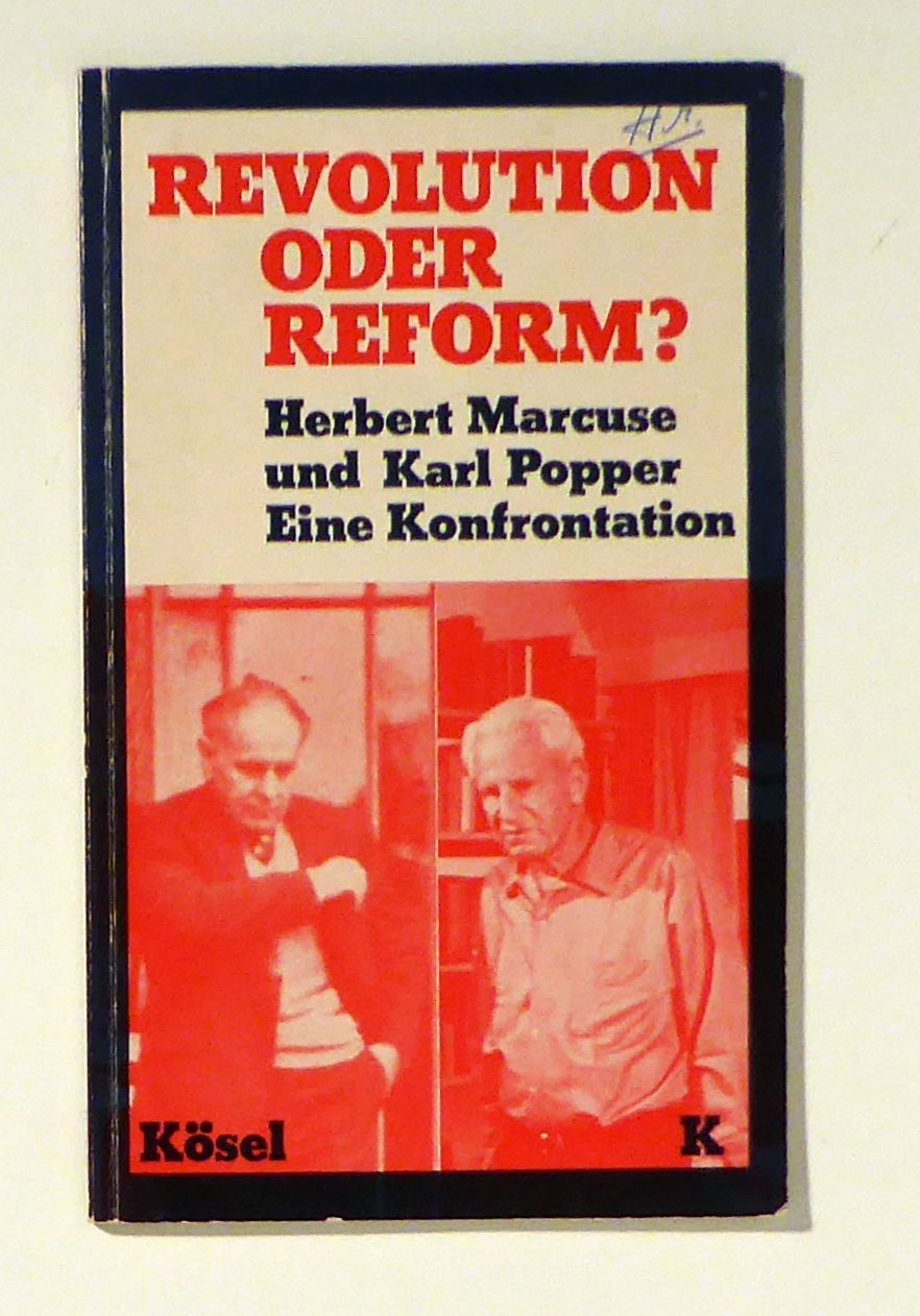 Herausgegeben von Franz Stark. München: Kösel, 1971. 48 S., Einband: Or.kt. Format: 8°. Vollständiger und erweiterter Text einer Fernsehdokumentation des Bayerischen Rundfunks vom 5. 1. 1971. Etwa 1 Million Fernsehzuschauer verfolgten die ARD-Sendung, in der Herbert Marcuse, der große Neomarxist, und Karl Popper, der große Neoliberale, "in fast bekenntnishafter Dichte" (Süddeutsche Zeitung) ihre gesell-schaftspolitischen Thesen darlegten. Hier wird zum ersten Mal der vollständige Text der Interviews, die für diese Fernsehdokumentation aufgenommen wurden, in ungekürztem Wortlaut vorgelegt