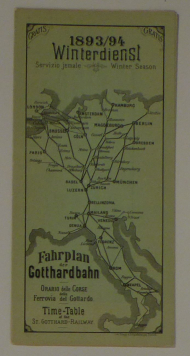 1893/94. Winterdienst. Servizio jemale. Winter Season. Zch.: Rüegg & Schaufelberger, 1893. 1 Bl., 5-fach gefaltet, Mit einer Kartenskizze auf Titel sowie verso mit einer Übersichtskarte der Gotthardbahn im Massstab 1:500,000. Einband: Original broschiert. Format: 56 x 19.5 cm (bxh), gefaltet 9.8 x 19.5 cm. Halbjährlich erscheinender, lithographierter Fahrplanprospekt der Gotthardbahn, welcher jeweils kostenlos an die Fahrgäste abgegeben wurde. Enthalten sind zudem die Fahrpreise von verschiedenen nationalen und internationalen Destinationen zu den wichtigsten Ortschaften entlang der Gotthardbahn. Text dreisprachig (deutsch, italienisch, englisch)