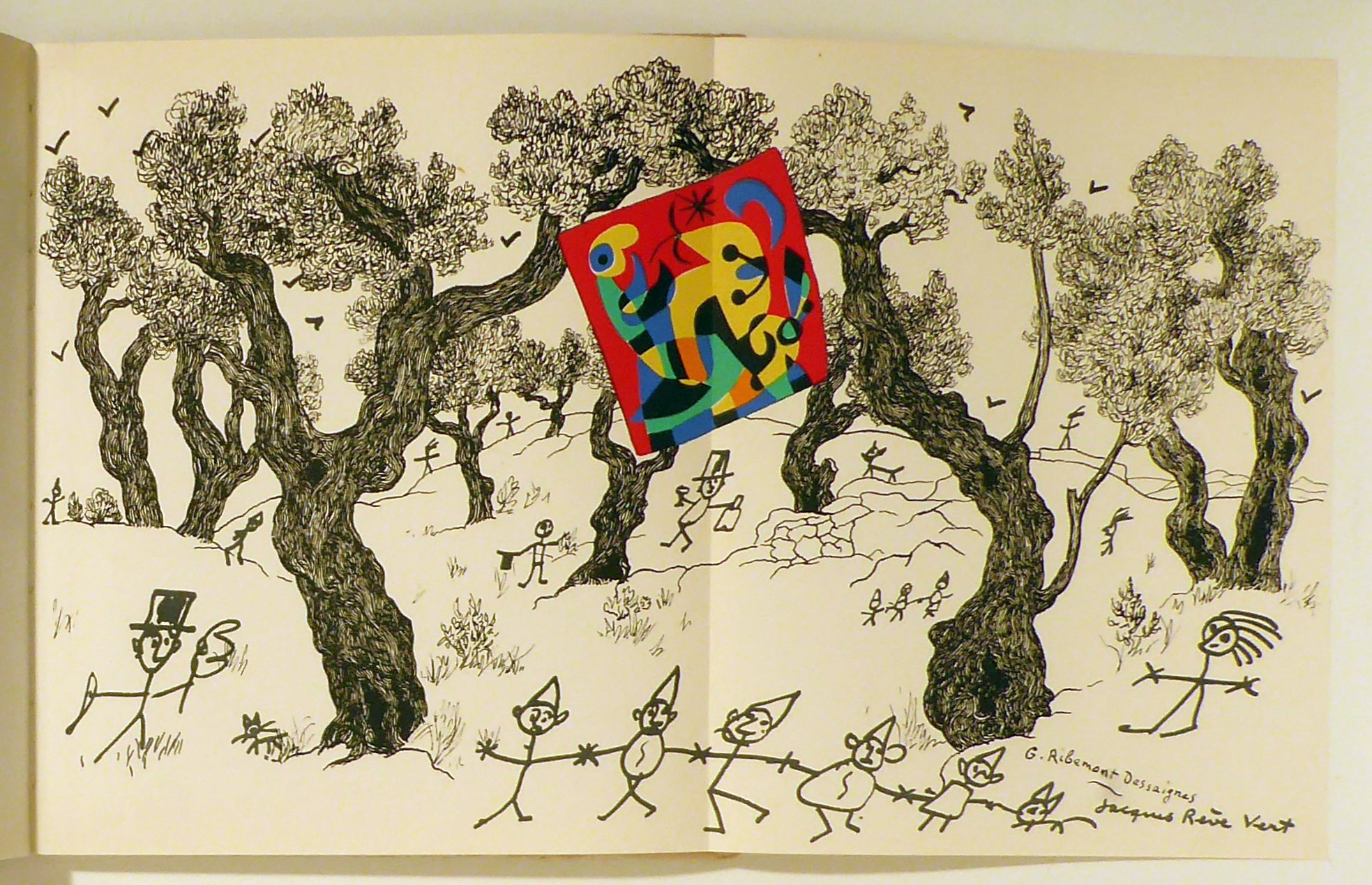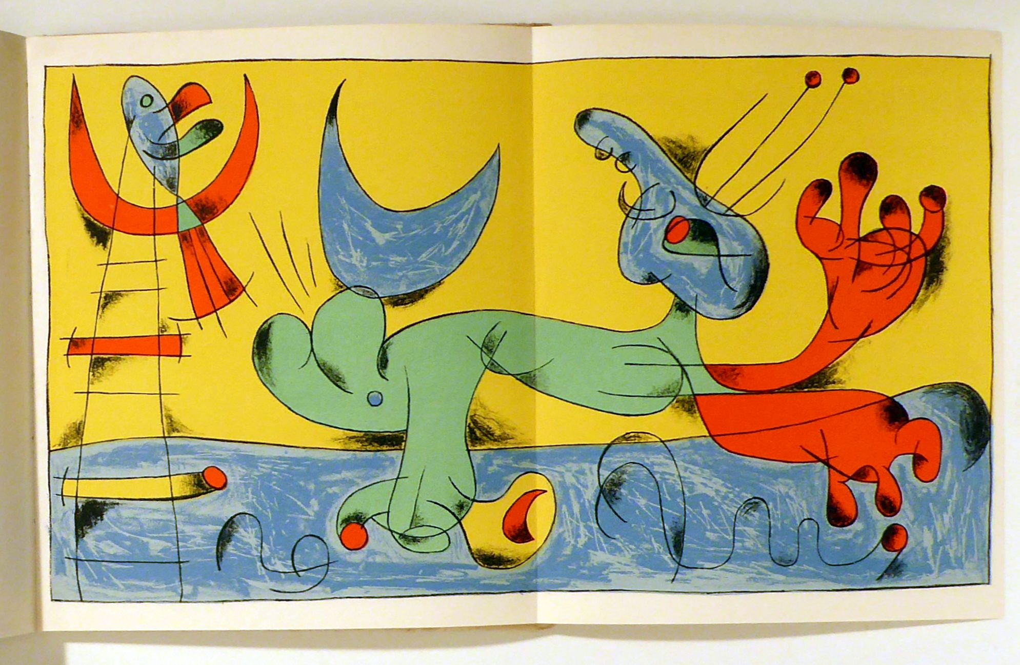 Paris: Maeght, 1956. 219 S., Einband: Original kartoniert, mit Schutzumschlag und transparenter Folie. Format: gr.8°. Erstausgabe. Mit 160 teils farbigen Abbildungen, davon 10 Original-Lithographien von Joan Miró, vier doppelblattgross, je eine auf der Vorder- und Rückkseite des Umschlags, 3 einseitige und eine als Titelseite. Mit Gedichten von Jaques Prévert sowie einem Essay von Georges Ribemont-Dessaignes. Die Lithographien druckte Mourlot frères