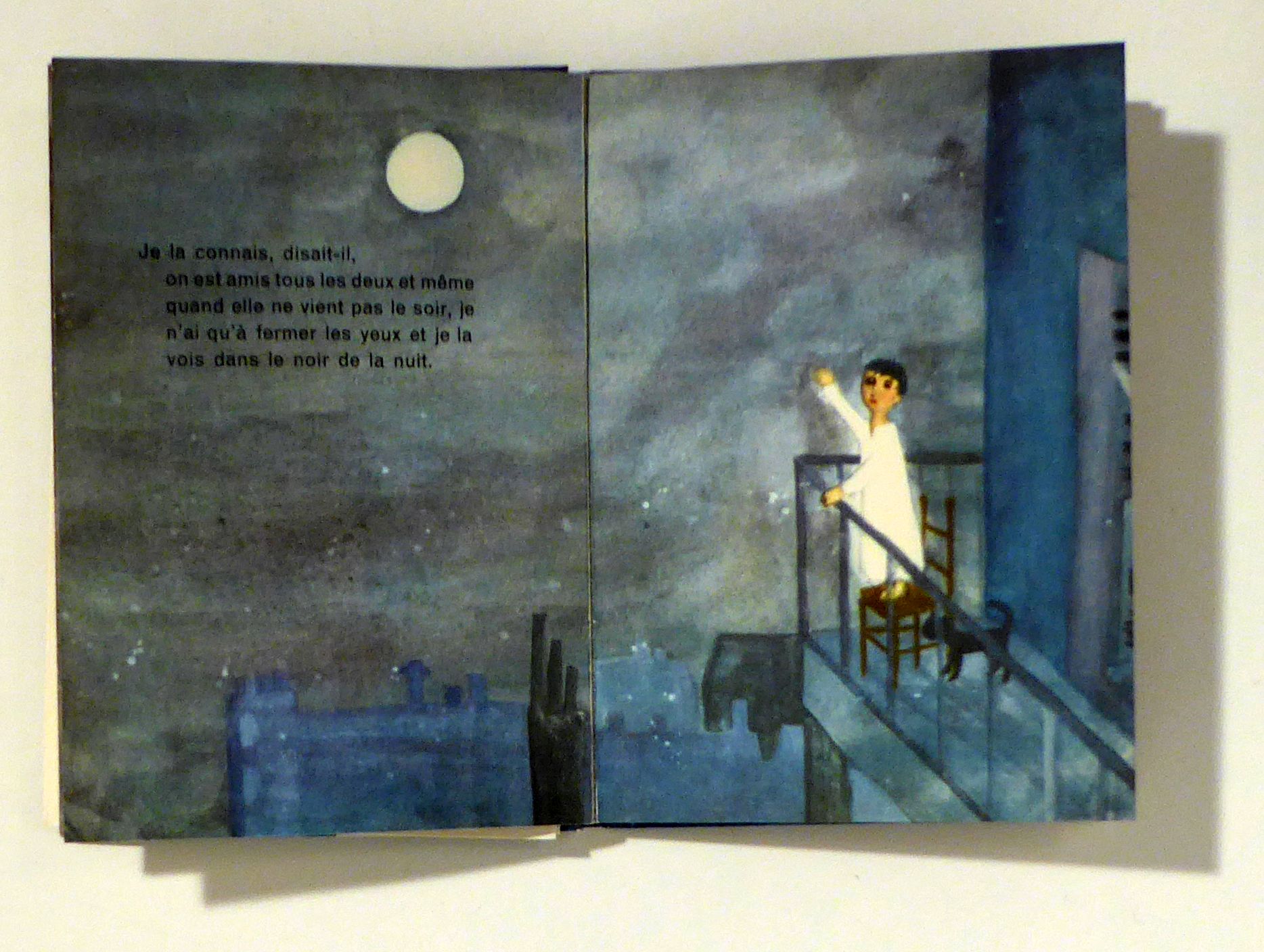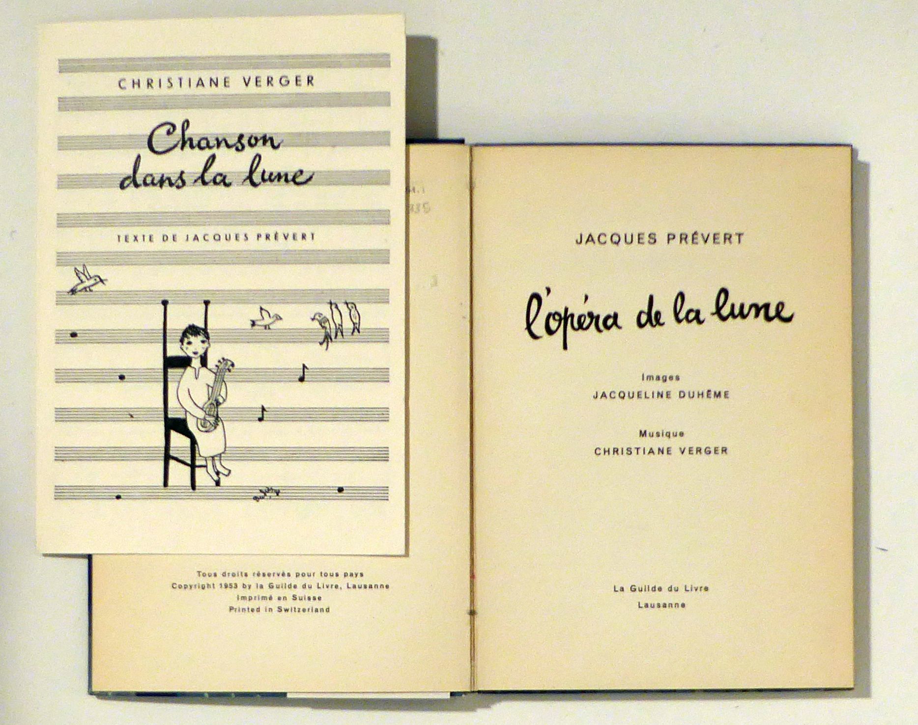 Images Jacqueline Duhême, musique Christiane Verger. Lausanne: La Guilde du Livre, 1953. (40) S., mit umlaufender Deckelillustration, illustrierten Vorsätzen sowie 6 doppelblattgrossen und 9 blattgrossen sowie zahlreichen mehrfarbigen Abbildungen im Text nach Aquarellen von Jacqueline Duhême. Einband: farbig illustr. Or.Pbd. Format: kl.8°. Erstausgabe. Beigelegt das meist fehlende gefaltete Blatt mit den Noten zum "Chanson dans la lune"; Musik Christiane Verger, Text Jacques Prévert