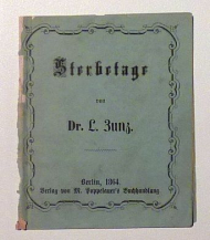 Bln.: M. Poppelauer, 1864. 27, (1) S., Einband: Or.br. Format: 10x11,5 cm. Erstausgabe. Verzeichnet in zwei Teilen (S. 1-20 und S. (21)-27) nach den Todestagen geordnete Kürzestbiographien wichtiger Persönlichkeiten des Judentums, namentlich der Neuzeit, vereinzelt aber auch aus dem Mittelalter. Der Autor, Leopold Zunz (1795-1886) gilt als "Begründer der Wissenschaft des Judentums" (Jüdisches Lexikon). Auf der hinteren Umschlagseite eine Verlagsanzeige von Poppelauer für in seinem Verlag erschienene Bibeln und religiöse Schriften in deutscher und russischer Sprache. Der erste Teil reicht von Januar bis 31. Juli, der zweite vom 1. August bis 30. September. Es dürfte ein Fortsetzung geplant gewesen sein für die restlichen Monate des Jahres, die ist aber nirgendwo nachgewiesen