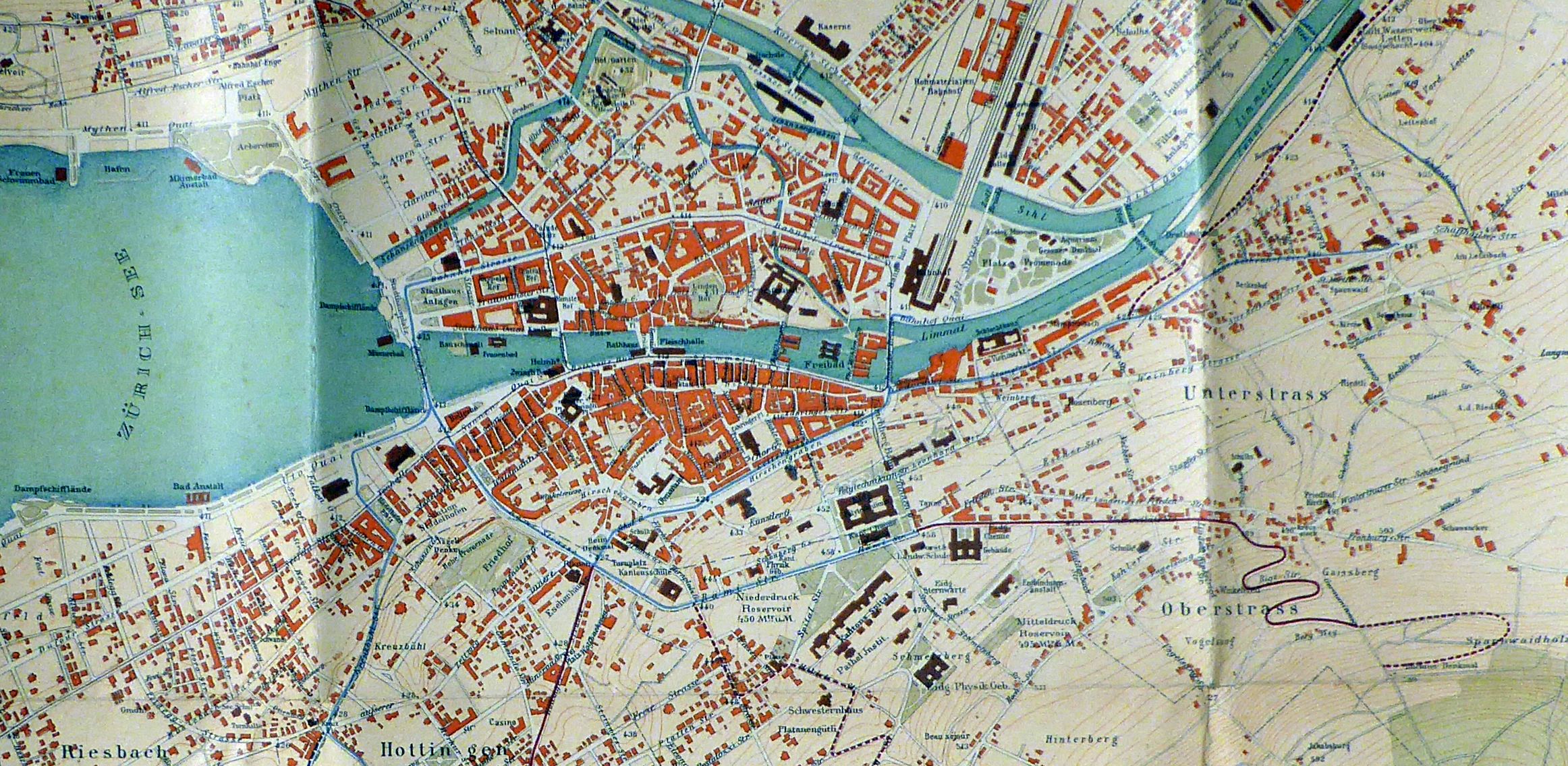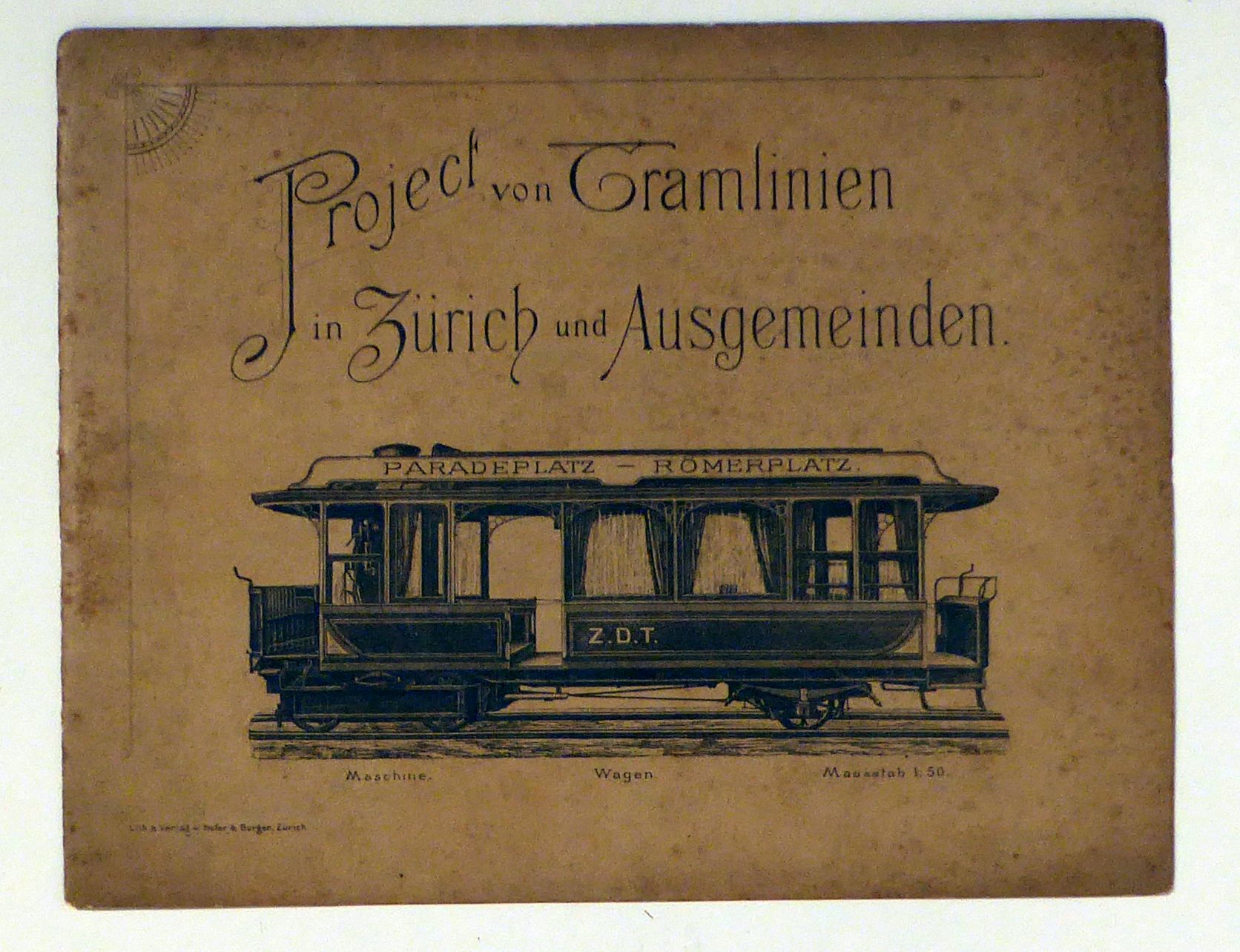 Zch.: Hofer & Burger, 1892. 14, [1] S., mit einer lithographierten Abbildung eines Motorwagens und einem mehrfach gefalteten Stadtplan von Zürich und denb Aussengemeinden. Einband: Original kartoniert, fadengeheftet. Format: 8°, quer. Konzessionsgesuch von A. Grether & Cie zu Handen des Schweizerischen Eisenbahndepartements in Bern für den Bau und den Betrieb von Tramlinien. Linie I: Vom Römerplatz, Hottingen, zum Pardeplatz; Linie 2: Pfauen, Hottingen bis Quaibrücke; Linie 3: Oberstrass - Kantonsschule - Quaibrücke - Paradeplatz; Linie 4: Kantonsschulplatz bis Bahnhofplatz; Linie 5: Krone/Unterstrass - Limmatquai. Titel auf dem Umschlag "Project von Tramlinien in Zürich und Ausgemeinden", abgebildet ist ein dreiachsiger Motorenwagen (für Dampfbetrieb), beschriftet mit Paradeplatz-Römerplatz. Der Stadtplan (Massstab 1:10000) ist mehrfarbig lithographiert und reicht im Norden bis zum Friedhof Aussersihl und im Süden knapp über Burgwies hinaus. In den Plan sind, neben den Strassen sowie gebauten und geplanten Eisenbahnlinien auch zahlreiche Firmen und Institutionen eingezeichnet. Nicht bei Hauri (Hofer & Burger)