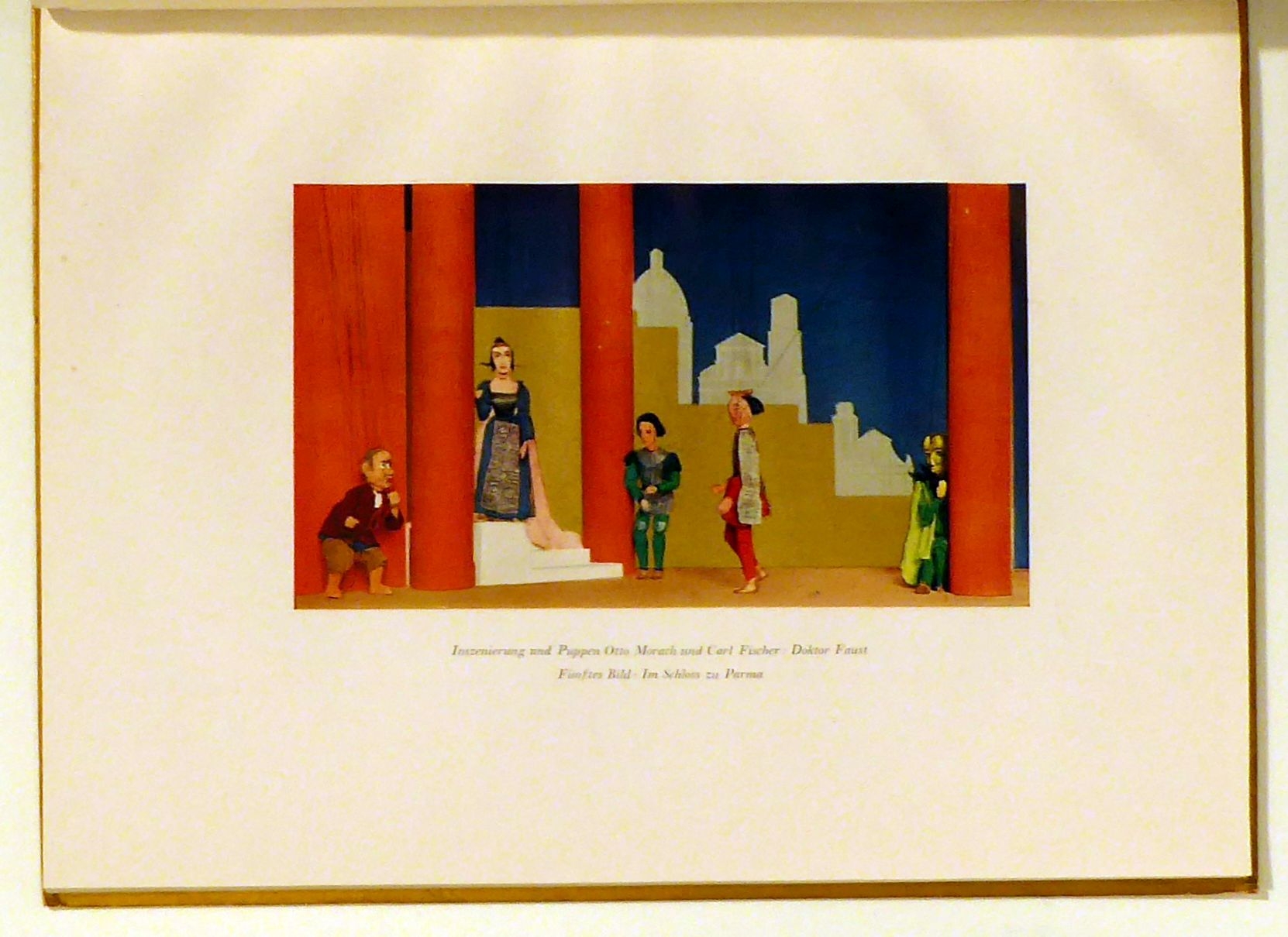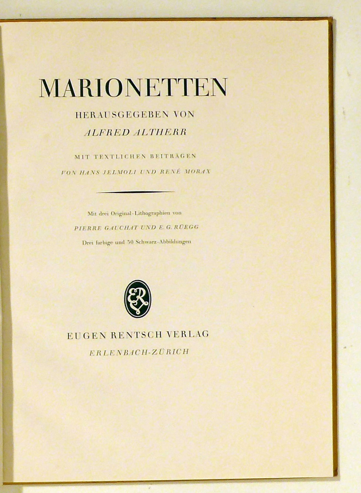 Mit drei Original-Lithographien von Pierre Gauchat und E(rnst) G(eorg) Rüegg. Drei farbige und 30 Schwarz-Abbildungen. Erlenbach-Zch.: Eugen Rentsch, [1926]. 54 S., mit 2 Original-Lithographien von Pierre Gauchat und 1 Original-Lithographie von Ernst Georg Rüegg. Einband: Or.Pbd. mit gold. Überzugpapier und Deckelvignette. Format: 4°. Erstausgabe. Mit Szenen-Bildern von Inszenierungen am Schweizerischen Marionettentheater in Zürich, dem Marionettentheater Meiringen und dem Théâtre Romand des Marionettes aus den 1920er Jahren. Schutzumschlag und Einband-Vignette von Ernst Gubler