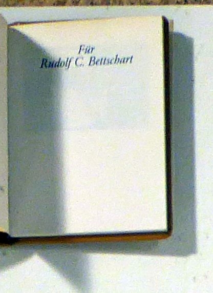 Mnch.; Düsseldorf: Meier & von Zittwitz, 1980. (24) S., mit s/w-Abbildungen nach Fotografien von Ingo Meier. Einband: Original-Leder. Format: 5x7 cm (bxh). Erstausgabe. Hellbrauner Ganzlederband auf vier doppelten Zierbünden und mit goldgeprägtem Titel und mit Kopfgoldschnitt. Aus Anlass des 50. Geburtstags von Diogenes-Verleger Rudolf C. Bettschart von Buchmarkt-Verleger Christian von Zittwitz verlegter Bildband mit Fotografien von Ingo Meier in einer einmaligen und auf ein Stück limitierten und nummerierten Vorzugsausgabe. Neben diesem handschriftlich nummerierten Exemplar gab es aber offensichtlich auch noch ein paar nichtnummerierte Vorausexemplare. "Siepi" ist der Name des in der Toscana gelegenen Landguts des Diogenes-Verlegers