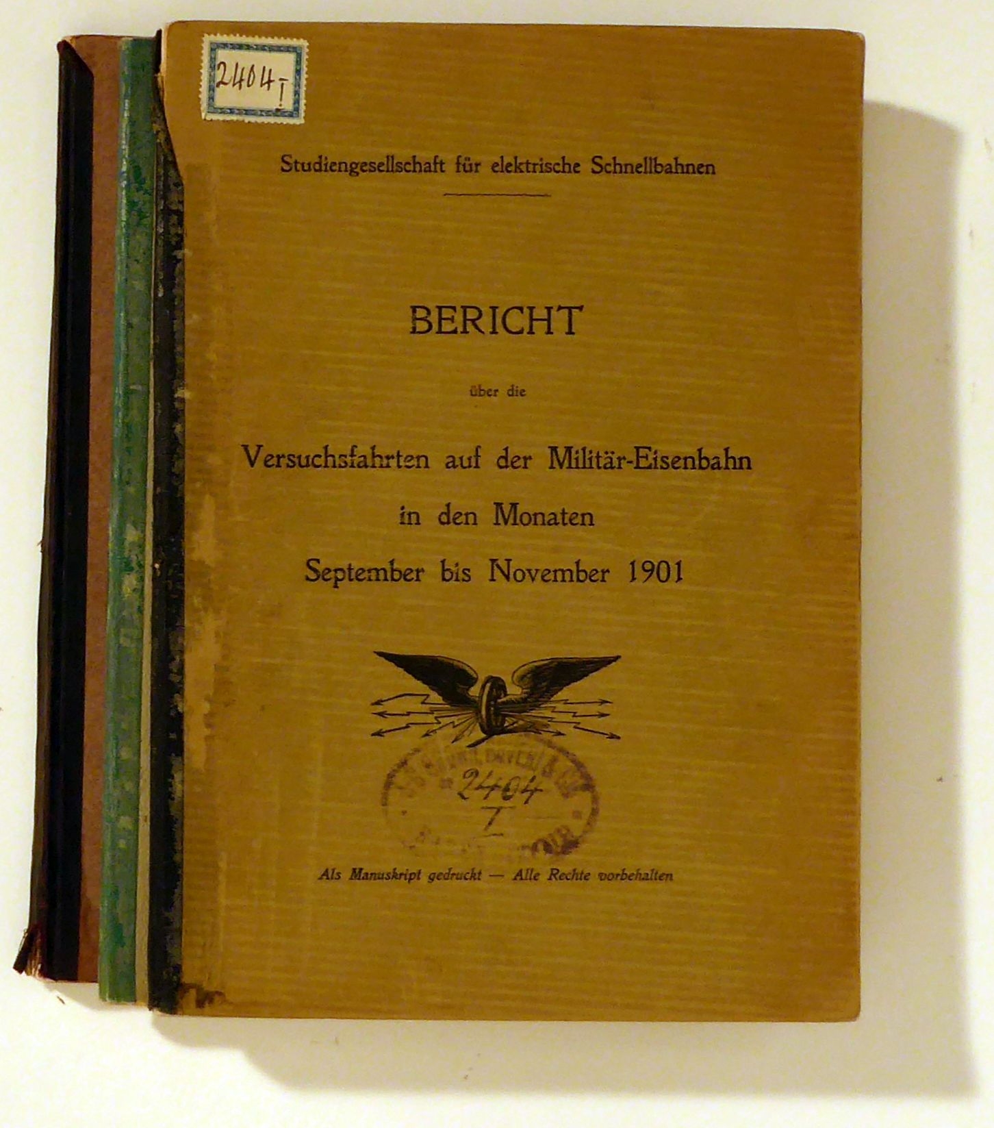 in den Monaten September bis November 1901, September bis November 1902, September bis November 1903. Bln.: Studiengesellschaft für elektrische Schnellbahnen, 1902-1904. 3 Bde., 95 S., 32 Tafeln, 42 S., 19 Tafeln, 71 S., 39 Tafeln, Mit zahlreichen Textabbildungen sowie Plänen auf 90 mehrfach gefalteten Tafeln. Einband: Original kartoniert mit Leinwandrücken. Format: 4°. Erstausgabe. Ausführliche Berichte über die in den Jahren 1901-1903 durchgeführten elektrischen Versuchsfahrten auf der Millitär-Eisenbahn-Strecke Marienfelde-Zossen bei Berlin