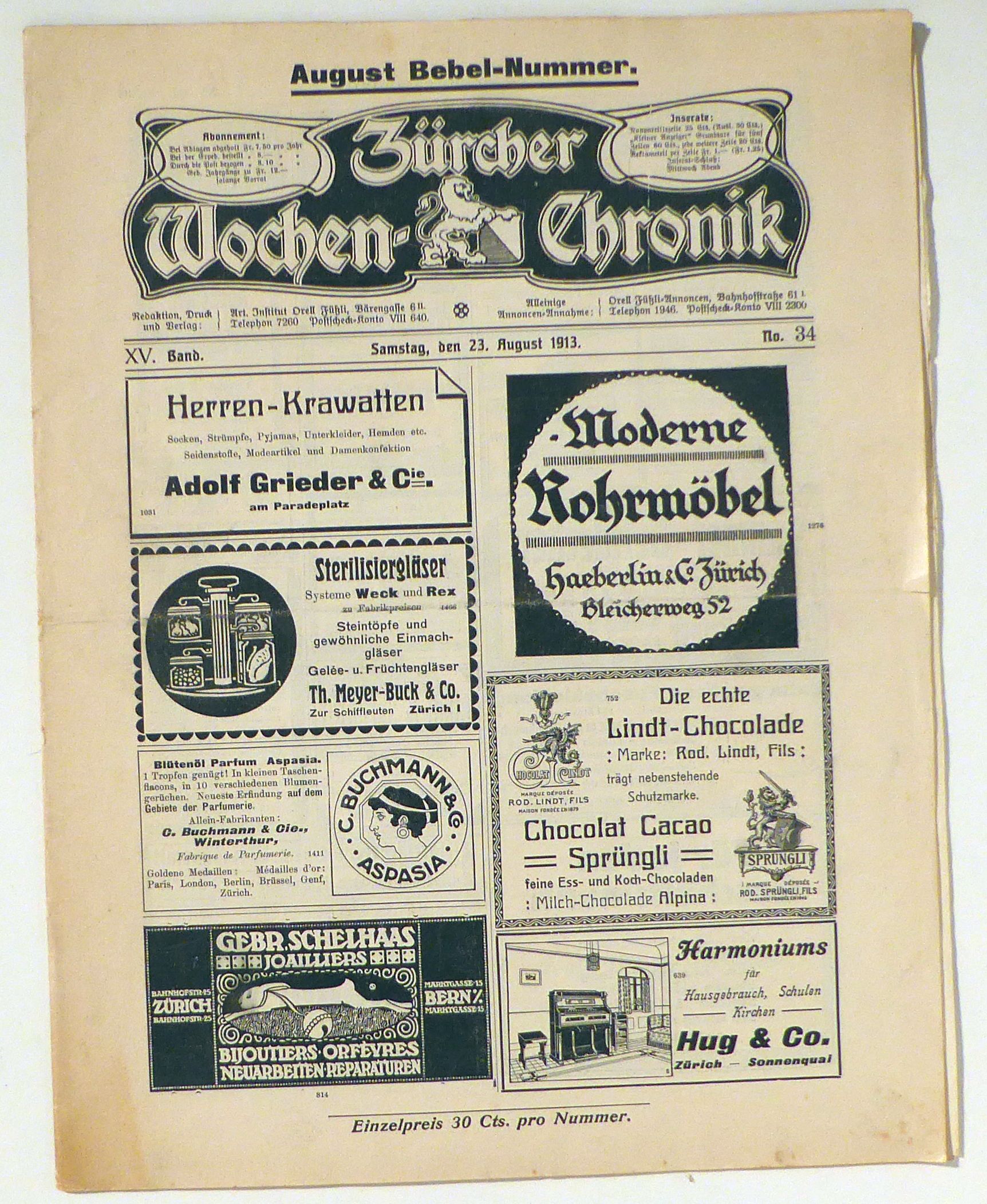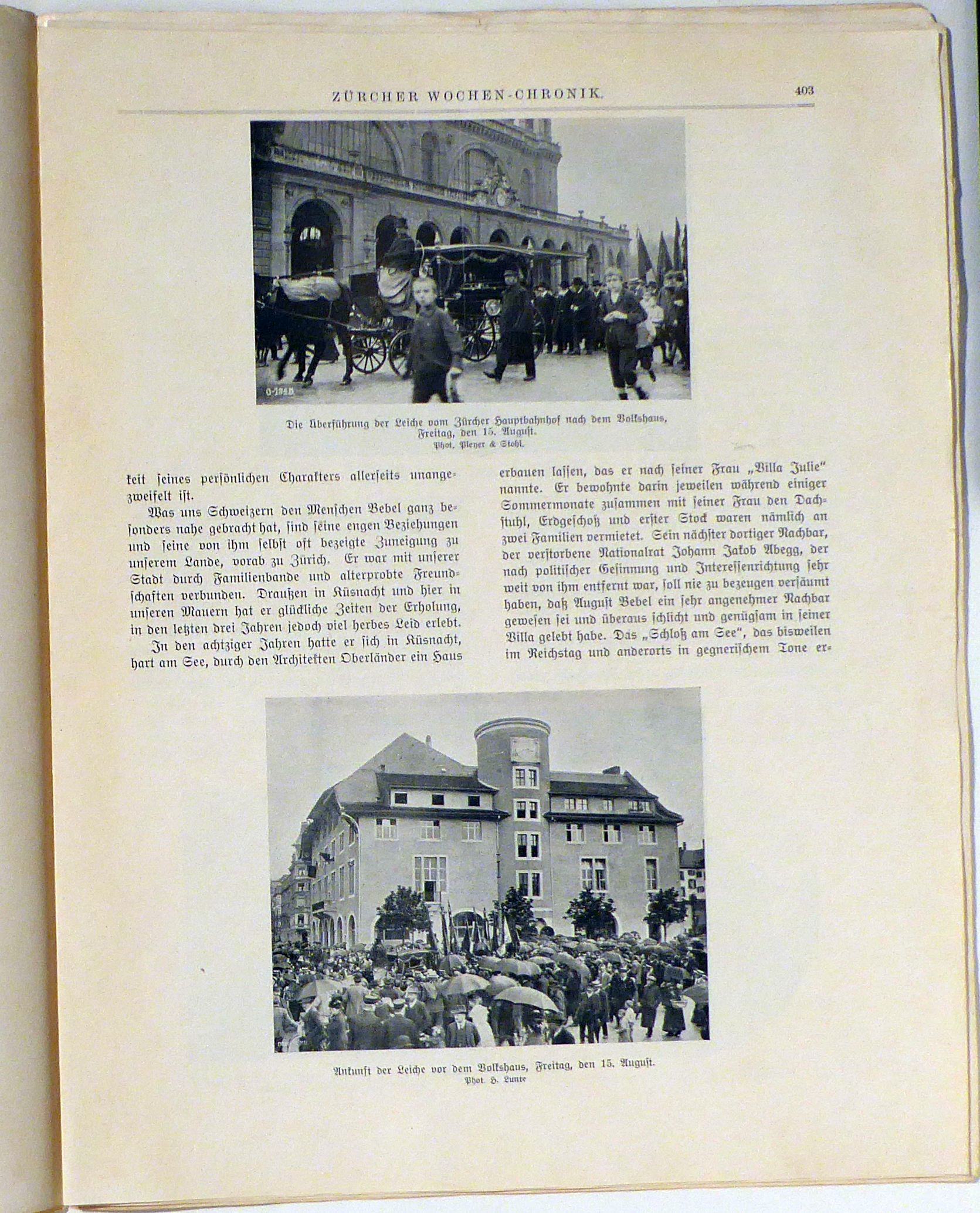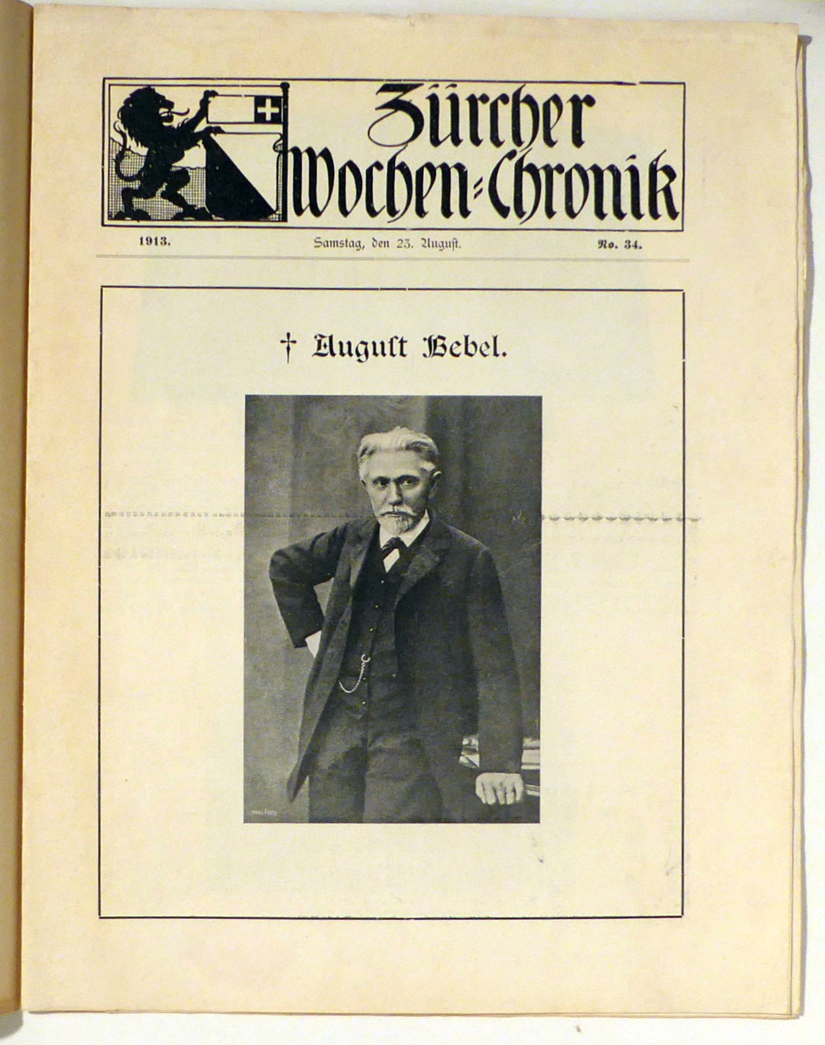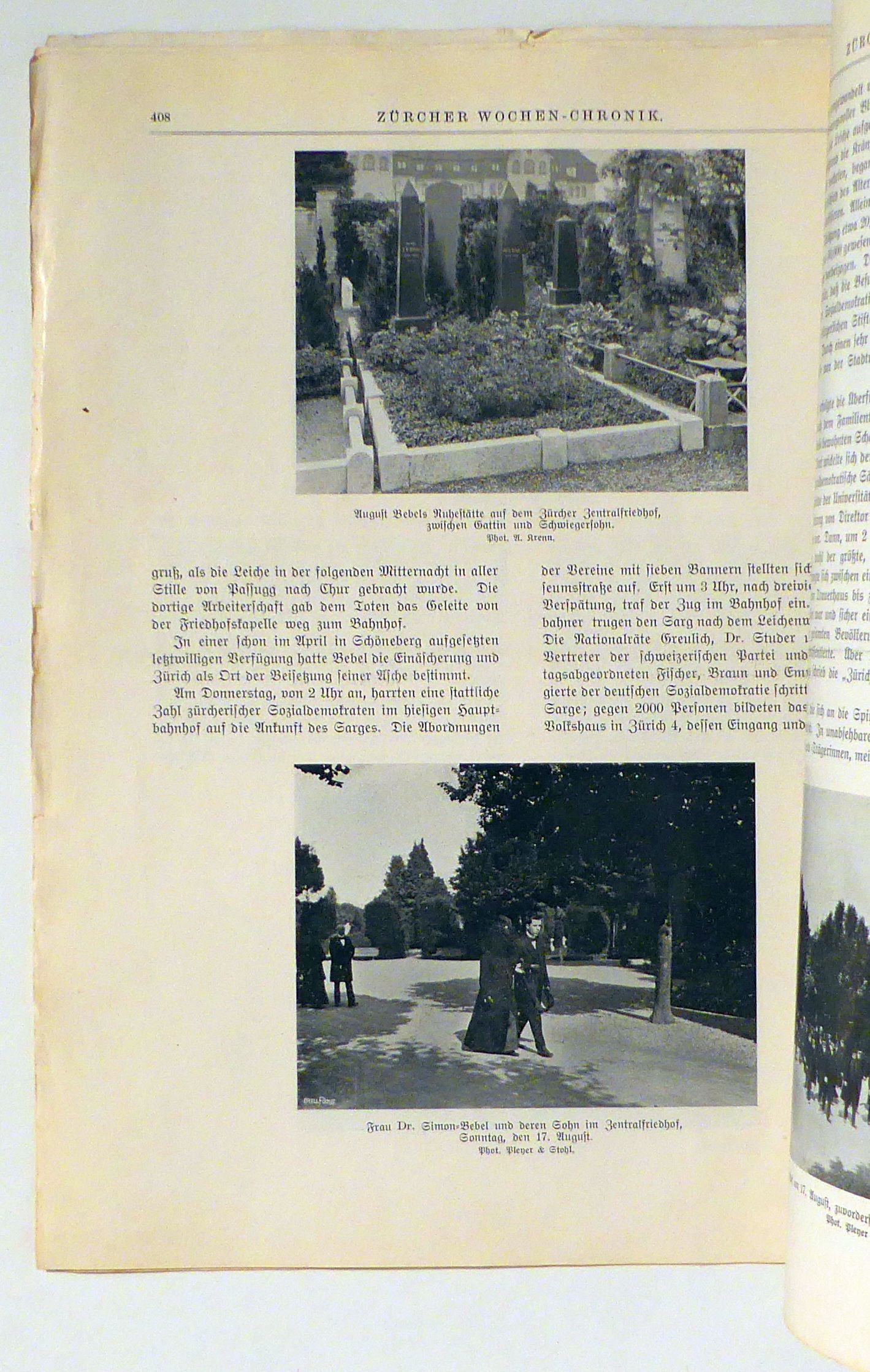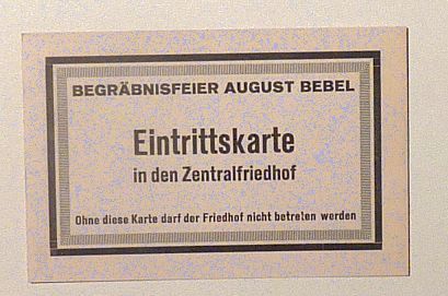 Eintrittkarte in den Zentralfriedhof - Ohne diese Karte darf der Friedhof nicht betreten werden. 1913. Format: 11,5 x 7,5 cm (bxh). Erstausgabe. Die Beerdigung von August Bebel am 17. August 1913 brachte Menschen aus ganz Europa nach Zürich. Mehr als 15000 Personen nahmen an der Trauerfeier teil. Der Zugang auf den Friedhof wurde deshalb reglementiert. Um Schaden an andern Gäbern zu vermeiden, wurden nur 1200 Personen eingelassen. Zu Chopins Trauermarsch zog die Menge von der Rämistraße durch Aussersihl zum Zentralfriedhof (heute Friedhof Sihlfeld). Bebel war häufig in der Schweiz zu Besuch seiner Tochter, die hier, verheiratet mit einem Arzt, lebte. Bebel war im Schweizer Bad "Passugg" zur Kur, als er starb und er hatte testamentarisch verfügt, dass er in Zürich beerdigt werde. Beigelegt die August Bebel-Nummer der "Zürcher Wochen-Chronik" vom 23. August 1913 (XV. Band, N°. 34, VIII, S. 401-410). Mit einer 10seitigen Reportage über die Beisetzung von August Bebel auf dem Zürcher Zentralfriedhof (später Sihlfeld) mit 18 s/w-Abbildungen nach Fotografien und einem Begleittext. Die "Zürcher Wochen-Chronik" war ein eher bürgerliches Blatt mit einem umfangreichen Anzeigenteil.
