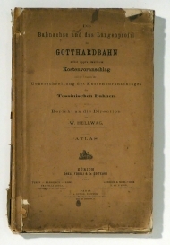 Erstattet von dem Oberingenieur W. Hellwag. Zürich, im Januar 1876. Zch.: Orell Füssli, 1876. 2 Bde.; Bd ,1 ca. 350 S. Bd. 2 7 Tafeln, mit zahlreichen Abbildungen nach Tabellen, Atlasband mit 7 teilweise mehrfach gefalteten Tafeln. Einband: Or. br. Format: 4°. in zwei Bänden. Band 1: Textband (I. Teil Grundlagen für das Projekt; II. Teil Beschreibung der Bahntrasse, III. Teil Kostenberechnung), Band 2 Atlas mit folgenden Falttafeln: Übersichtskarte der Gotthardbahn (Massstab 1:100'000); Längenprofil der Gotthardbahn (Massstab 1:100'0000); Vergleich zwischen den entsprechenden Hähenlagen der Thalsohle der Poststrasse u. den verschiedenen Bahnprojecten Flüelen-Göschenen (Massstab 1:25'000); Vergleich zwischen den entsprechenden Höhenlagen der Thalsohle, der Poststrasse u. den verschiedenen Bahnprojecten Airolo-Biasca (Masssstab 1:25'000); Hebungs Curven bei Gurtnellen, Pfaffensprung & Wassen (Massstab 1:10'000); Hebungs Curven bei Dazio (Massstab 1:10'000); Hebungs Curven bei Giornico (Massstab 1:10'000). Titel auf Einband: Die Bahnachse und das Längeprofil der Gotthardbahn nebst approximativem Konstenvoranschlag und die Ursachen der Ueberschreitung des Kostenvoranschlages der Tessinischen Bahnen Bericht and die Direction von W. Hellwag, Ober-Igenieur der Gotthardbahn