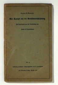 Ein Ausschnitt aus der Geschichte der Juden in Deutschland. Bln.: Schocken, 1936. 63, [1] S., Einband: Or.br. fadengeheftet. Format: kl.8°. Reihe: Jüdische Lesehefte, Heft 13; hrsg. von A[dolf] Leschnitzer.