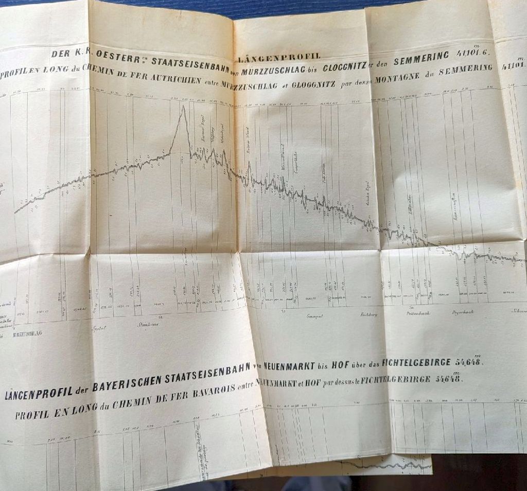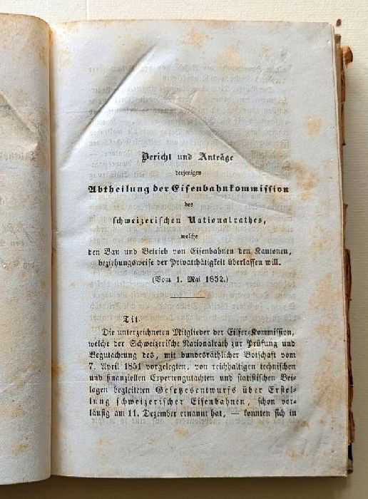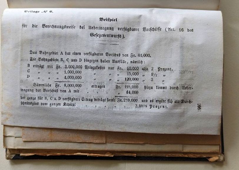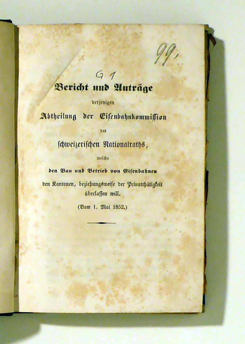 Beigebunden: Bericht der Mehrheit der nationalräthlichen Eisenbahnkommission. [Bern]: [s. n.], [1852]. 101, [4], 206 S., Einband: Or.Hlwd. Format: 8°. Im "Bericht der Mehrheit der nationalräthlichen Eisenbahnkommission" wurden zwei Bogen in der Reihenfolge falsch eingebunden, nach der Seite 112 kommen die Seiten 117-124 und erst dann die Seiten 113-116. Das Beilagenverzeichnis des Mehrheitsberichts zählt 12 meist mehrfach gefaltete Beilagen mit umfangreichen ökonomischen und finanziellen Berechnungen, den Gesetzesentwürfen sowie ein grosses [127x46 cm, (bxh)] mehrfach gefaltetes Blatt, auf dem das Längenprofil der Linie Frauenfeld - St. Gallen - Rorschach dem der K.K. Österreichischen Staatseisenbahn von Mürzzuschlag nach Gloggnitz über den Semmering sowie dem der Württenbergischen Staatseisenbahn von Göppingen bis Ulm über die Raue Alp und dem der Bayerischen Staatseisenbahn von Neuenmarkt bis Hof über das Fichtelgebirge gegenübergestellt wird. Nicht aufgeführt im Verzeichnis ist eine weitere Beilage [71x39 cm, (bxh)] auf der die Längenprofile der Strecken Murten - Bern, Wynigen - Solothurn und Bern - Burgdorf miteinander verglichen werden.