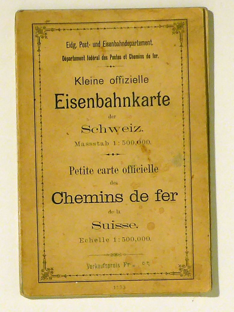 Massstab 1:500,000. Echelle 1:500,000. Bern: Kümmerly & Frey, 1899. Format: 76 x 56 cm; gefaltet 12.5 x 19 cm. Karte des Eisenbahnnetzes der Schweiz sowie des angrenzenden Auslandes aus dem Jahr 1899. Herausgegeben durch das Eidg. Post- und Eisenbahndepartement