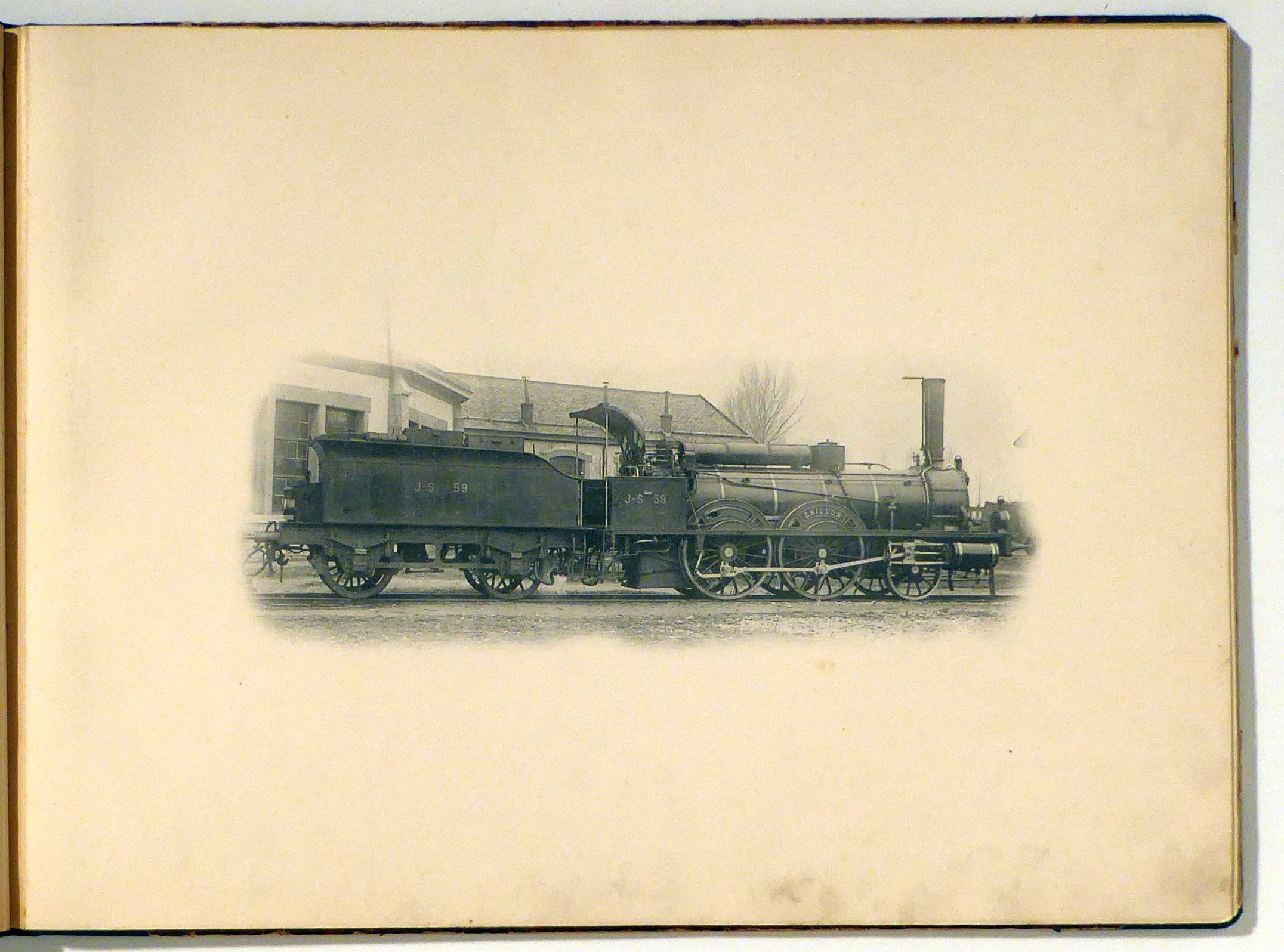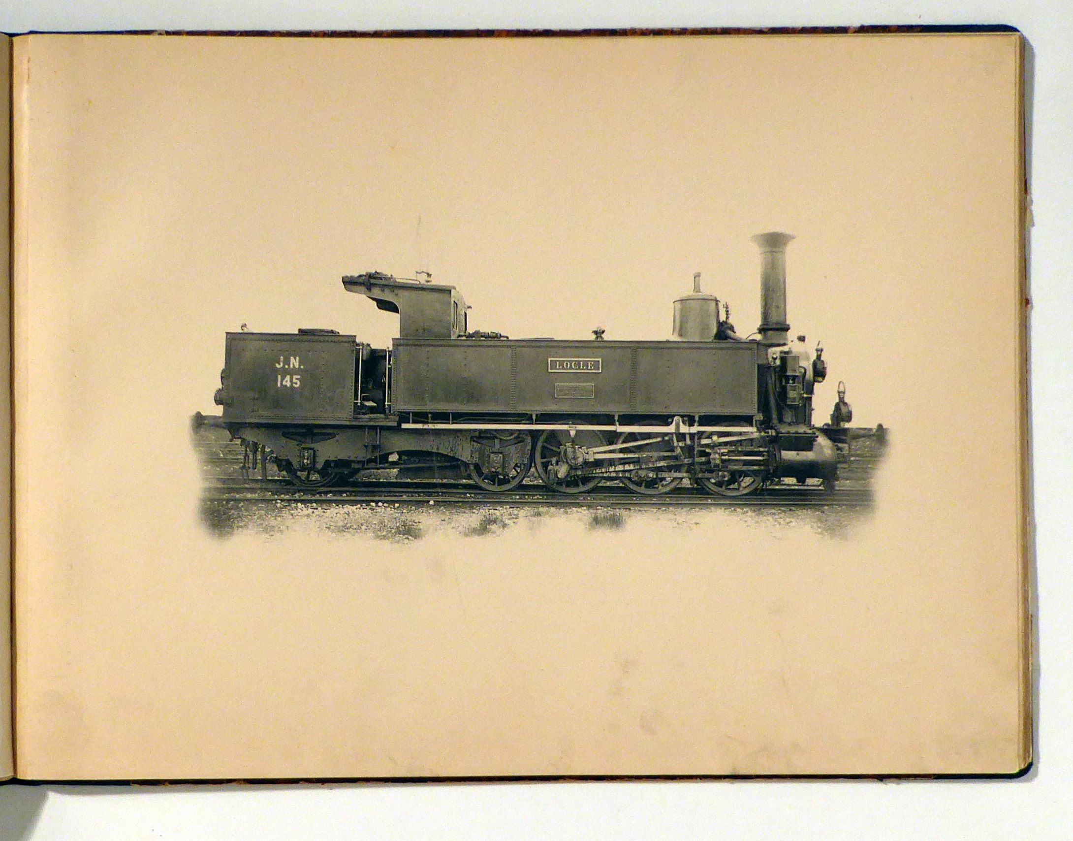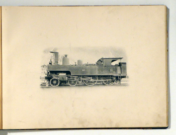 o.O.: o.V., um 1900. 32 Bll., Einband: Halbleinwand. Format: gr.8°, quer. Vermutlich privat in Auftrag gegebenes Album mit unter Verwendung von im Lichtdruck hergestellten Abbildungen schweizerischer Dampflokomotiven um 1900. Die meisten Maschinen sind als Produkte der Schweizerischen Lokomotiv- und Maschinenfabrik, Winterthur, erkennbar. Sieben gehören der Jura-Sipmplon-Bahn (JS), darunter die Lokomotiven "Chillon", "St. Maurice", "Cologne", "Brünig" und "Le Chamois". Ferner ist die "Locle" von der J-N und sind die "Solothurn" und "Friedrichshafen"abgebildet, bei denen aber keine Gesellschaft erkennbar ist sowie die Zahnradlokomotive "Montreux". Bei den übrigen Maschinen wurde die Zugehörigkeit nicht ermittelt. Einband im Kontor-Stil - breiter dunkelgrüner Kolikorücken, marmorierte Überzugspapiere und ein nicht beschriftetes Titeletiket. Mit grosser Wahrscheinlichkeit ein Unikat