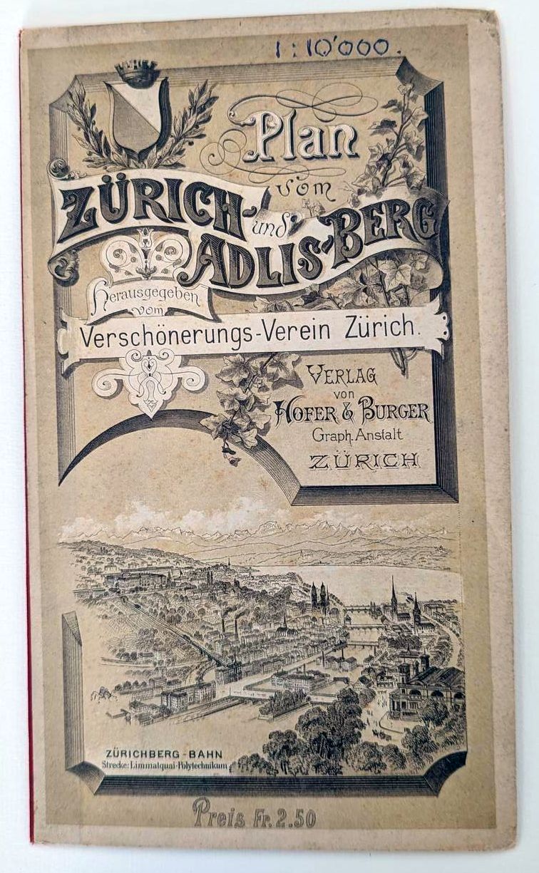 Herausgegeben vom Verschönerungsverein Zürich. Gezeichnet von E. Frtischi, Geom. in Oberstrass. Maasstab: 1:10000. Zch.: Hofer u. Burger, 1891. 1 Bl., mehrfach gefaltet, Einband: Or.Hlwd.-Mappe. Format: 56 x 42 cm (bxh); gefaltet 13 x 21 cm. Erstausgabe. Hauri (Hofer & Burger) 331. Lithographierte Karte. Auf der Vorderseite der Mappe eine Abbildung der Altstadt von Zürich mit der Zürichberg-Bahn [heutige Polybahn] und auf der Rückseite der Mappe eine Abbildung des Waldhaus Degenriet sowie ein Panorama. Unten links Anmerkung "Rev. Frühjahr 1891"