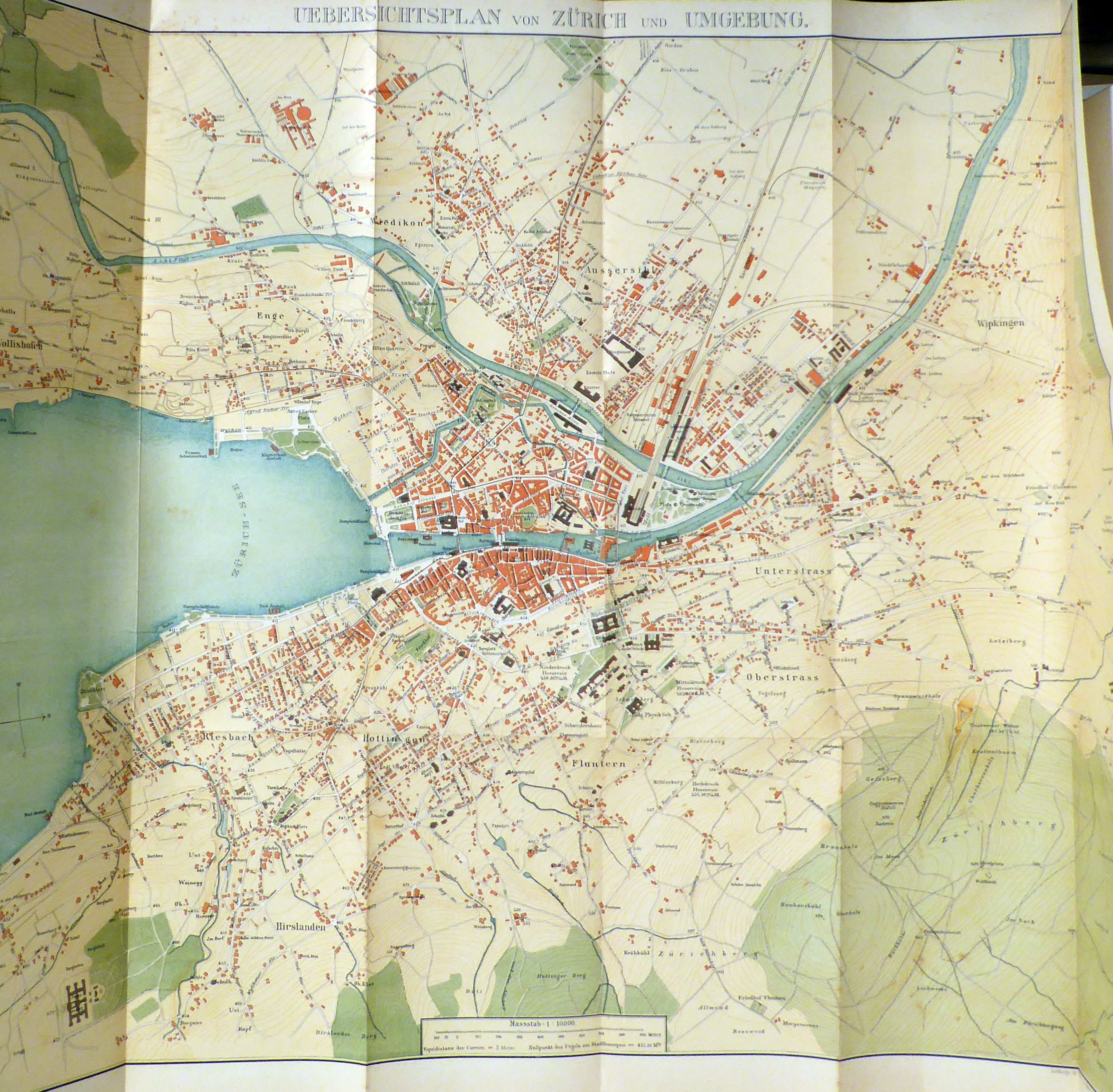 Maasstab 1:10000 mit Angabe von Höhenzahlen, Horizontalcurven, öffentlichen Gebäuden, Wald und Anlagen, Tramway. Farbendruckausgabe. Zürich: Hofer & Burger, 1889. 1 Bl., mehrfach gefaltet, Einband: Klappenmappe in Karton, mit Leinwandrücken. Format: 65 x 54 cm (bxh); gefaltet 13 x 21 cm. Erstausgabe. Lithographierte mehrfarbige Karte der Stadt Zürich und den umliegenden, damals noch selbstständigen Gemeinden Wollishofen, Enge, Wiedikon, Aussersihl, Wipkingen, Unterstrass, Oberstrass, Fluntern, Hottingen, Hirslanden und Riesbach. Auf der Rückseite ein Auszug aus dem Verlagskatalog