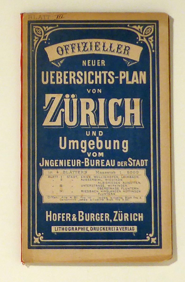 In 4 Blättern. Maasstab 1:5000. Blatt III: Stadt, Unterstrass, Wipkingen, Oberstrass, Fluntern. Zch.: Hofer & Burger, [um 1890]. 1 Bl., mehrfach gefaltet, Einband: Klappenmappe in Karton mit schmalem Leinwandrücken. Format: 82 x 60 cm (bxh); gefaltet 13 x 22 cm. Lithographierte Karte. Blatt 3 (von 4). Mit den Quartieren Aussersihl, Fluntern, Oberstrass, Unterstrass und Wipkingen. Die Karte ist undatiert. Sie war vermutlich zur Veröffentlichung anlässlich der ersten Stadterweiterung von 1892 geplant. Nicht bei Hauri (Hofer & Burger)