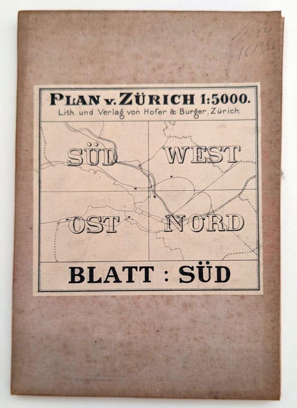 Uebersichtsplan der Stadt Zürich. Zch.: Hofer & Burger, [um 1890]. 1 Bl., mehrfach gefaltet, Einband: auf Leinwand aufgezogen mit Titelschild. Format: 82 x 58 cm (bxh); gefaltet 14 x 20 cm. Auf Leinen aufgezogene lithographierte Karte. 1 Blatt von insgesamt 4 Blättern. Mit den Quartieren Unter-Leimbach, Wollishofen und Enge. Die Karte, eine Version des später veröffentlichten vierteiligen Plans "Offizieller Neuer Uebersichts-Plan von Zürich und Umgebung" ist undatiert. Sie war vermutlich zur Veröffentlichung anlässlich der ersten Stadterweiterung von 1892 geplant. Nicht beiHauri (Hofer & Burger)